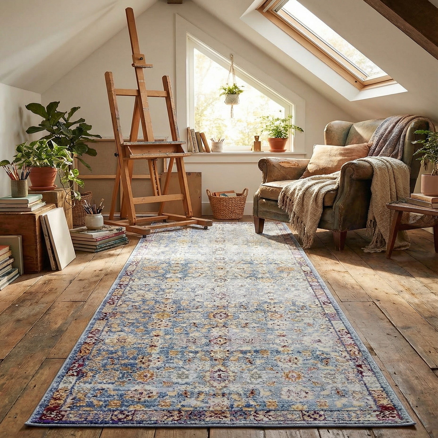 Primary color is Blue. Colors in this rug include: Blue, Gold, Gray, Green, Violet, Pink, Red.