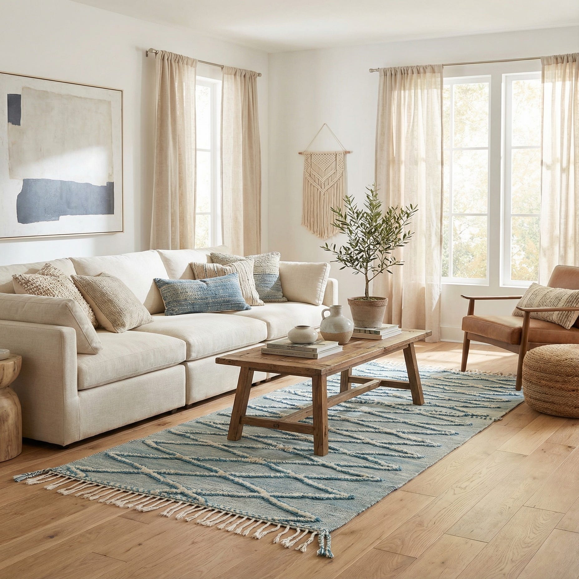Primary color is Blue. Colors in this rug include: Blue, Ivory.