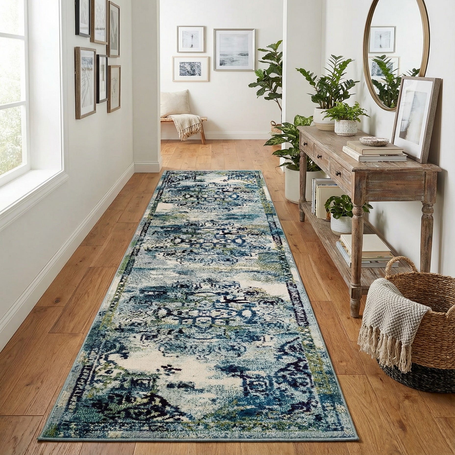 Primary color is Blue. Colors in this rug include: Blue, Brown, Cream, Green, Navy Blue, Yellow.