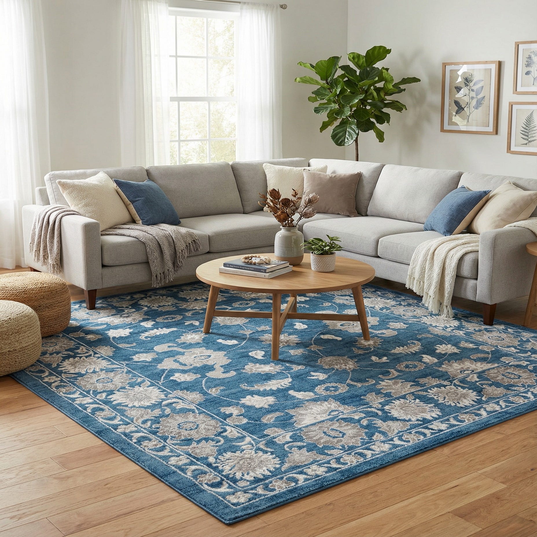 Primary color is Blue. Colors in this rug include: Blue, Gray, Ivory.