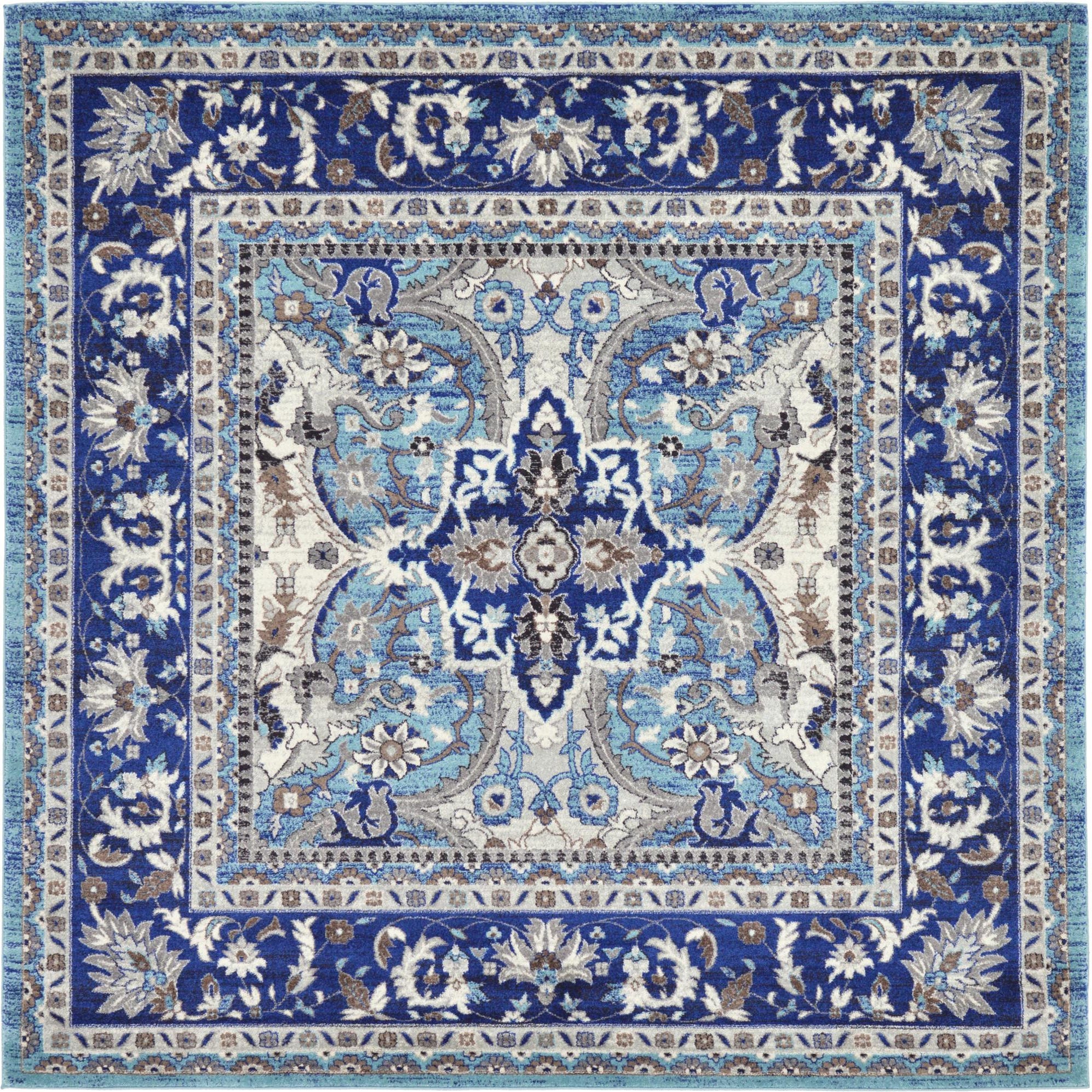 Primary color is Blue. Colors in this rug include: Blue, Black, Gray, Ivory, Navy Blue.
