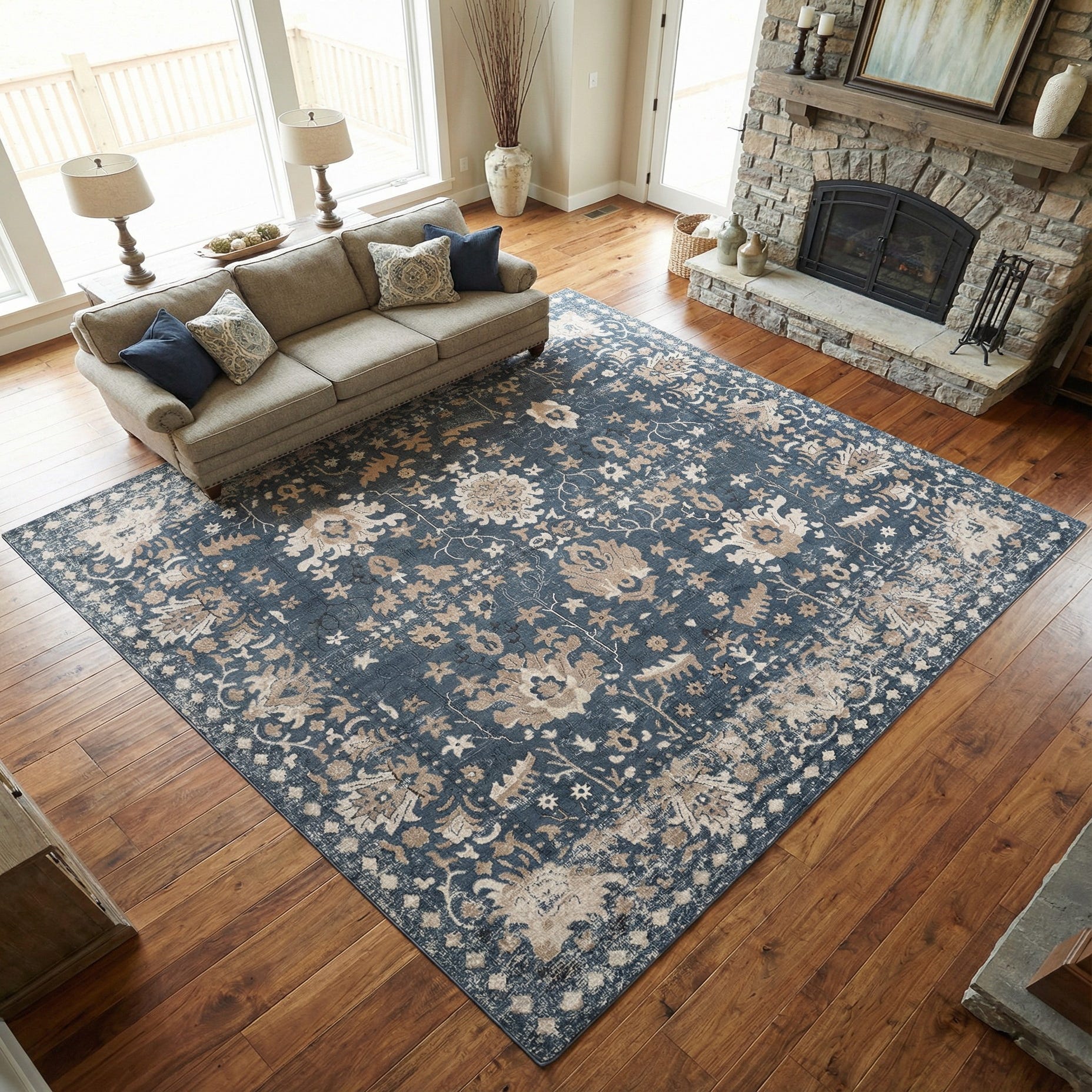 Primary color is Blue. Colors in this rug include: Blue, Beige, Ivory, Light Brown.