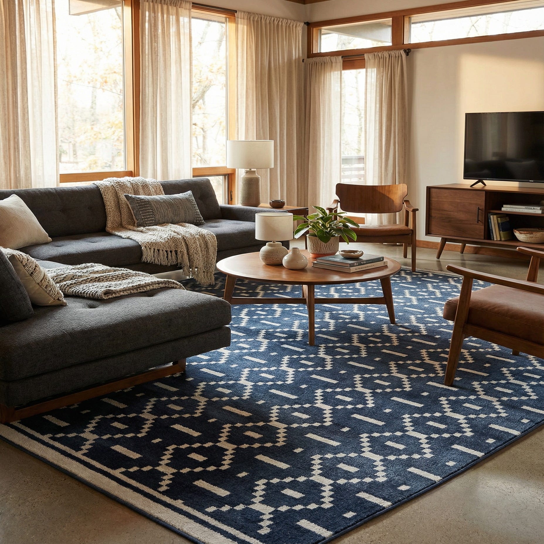 Primary color is Blue. Colors in this rug include: Blue, Ivory.