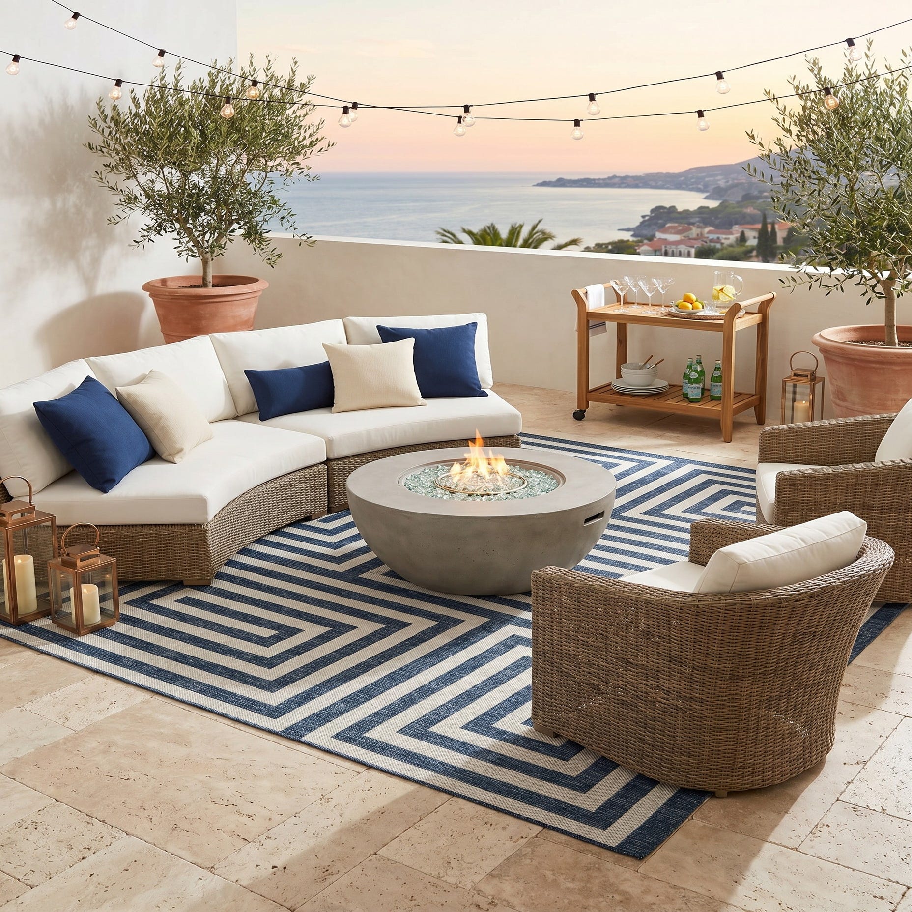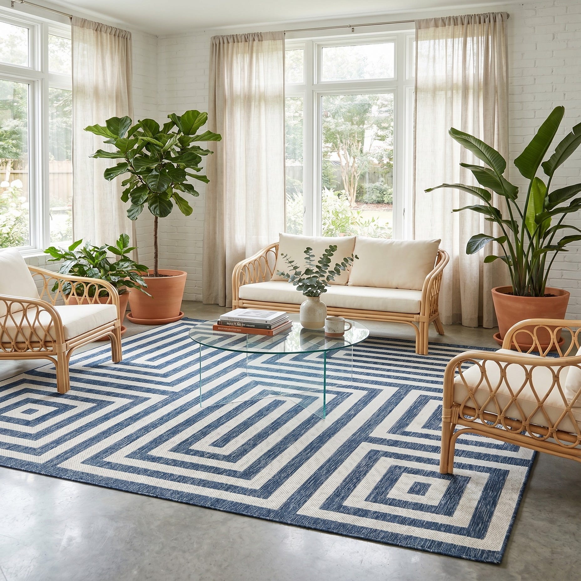 Love the contemporary look of this rug! We are so happy we chose this to accent the blue of our pool with our living area on our lanai. We still are going to add a few more pillows but love the rug to add color.