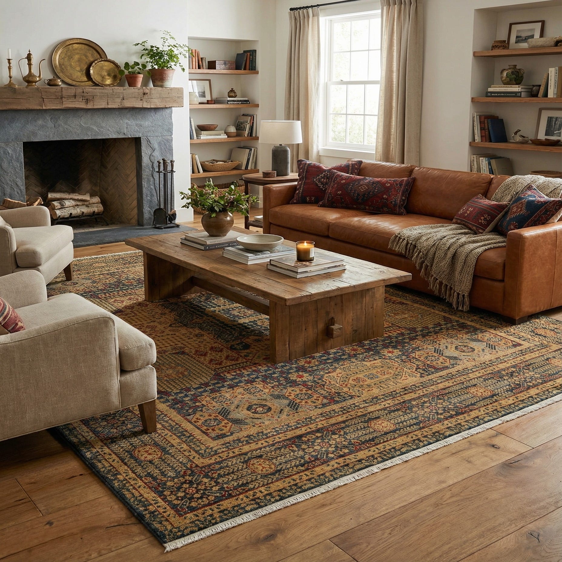 Primary color is Blue. Colors in this rug include: Blue, Light Blue, Light Brown, Red, Tan, Olive, Light Green.