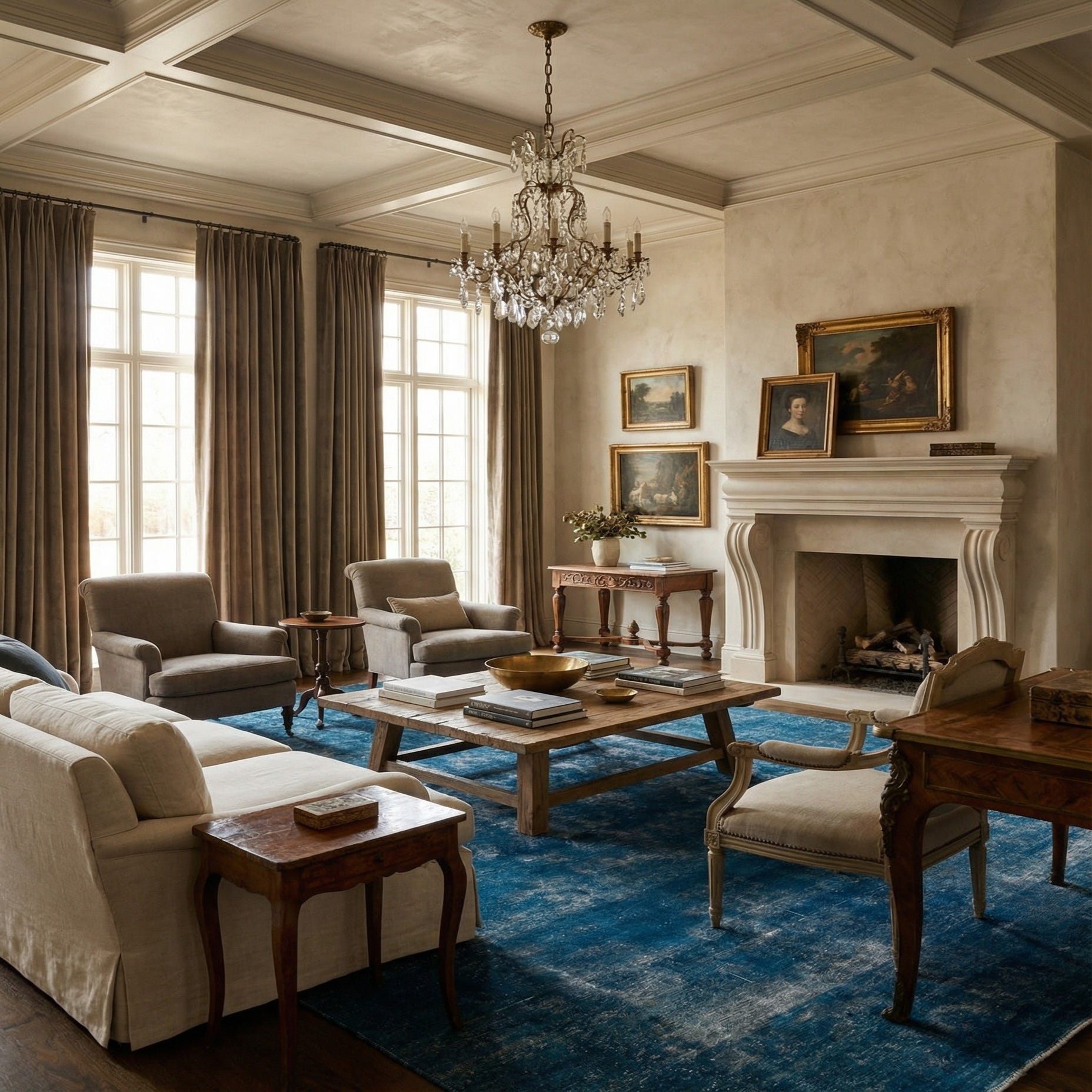 Primary color is Blue. Colors in this rug include: Blue, Ivory, Green.