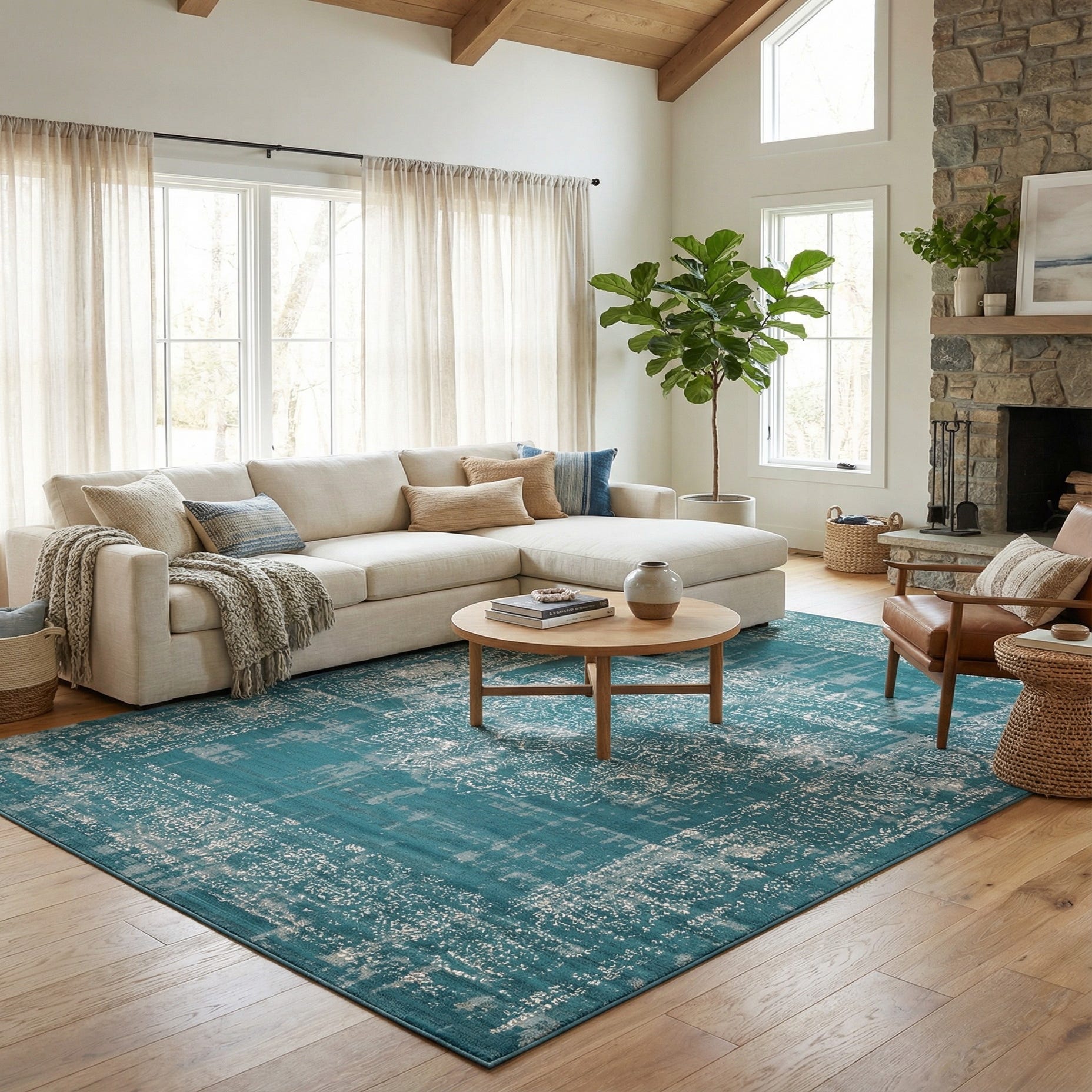 Primary color is Blue. Colors in this rug include: Blue, Ivory.