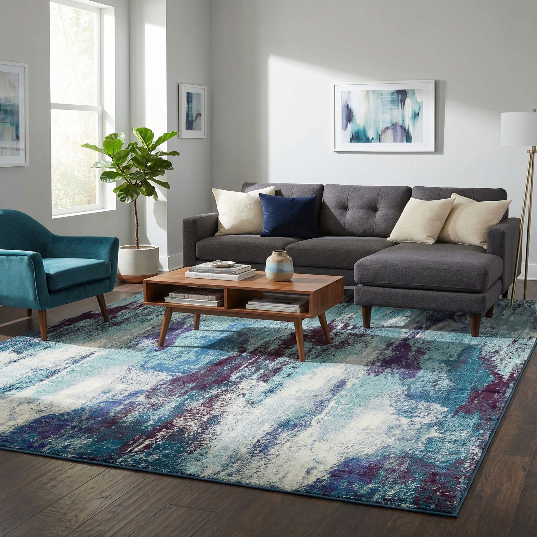 Primary color is Blue. Colors in this rug include: Blue, Gray, Navy Blue, Turquoise, Ivory.