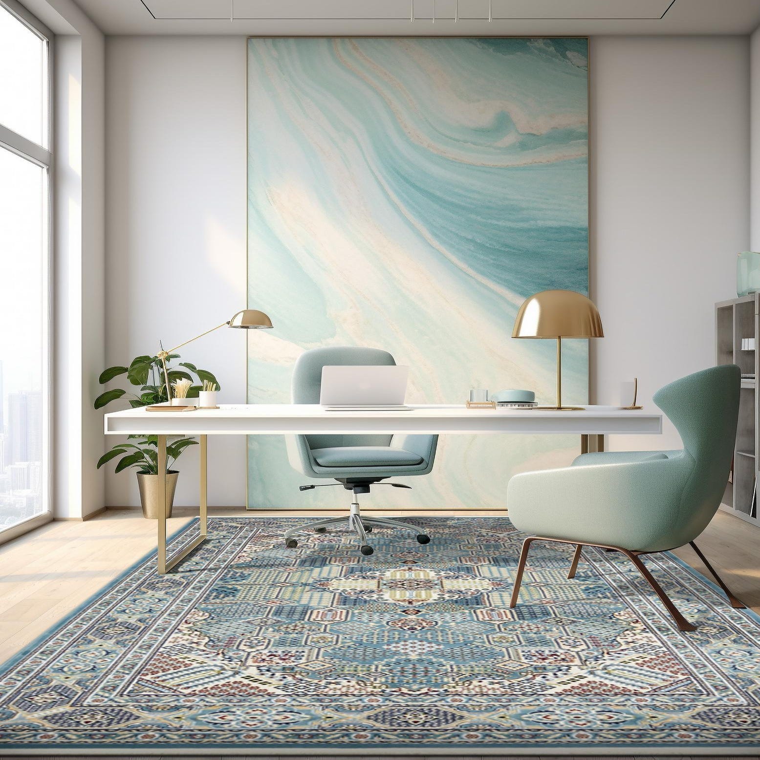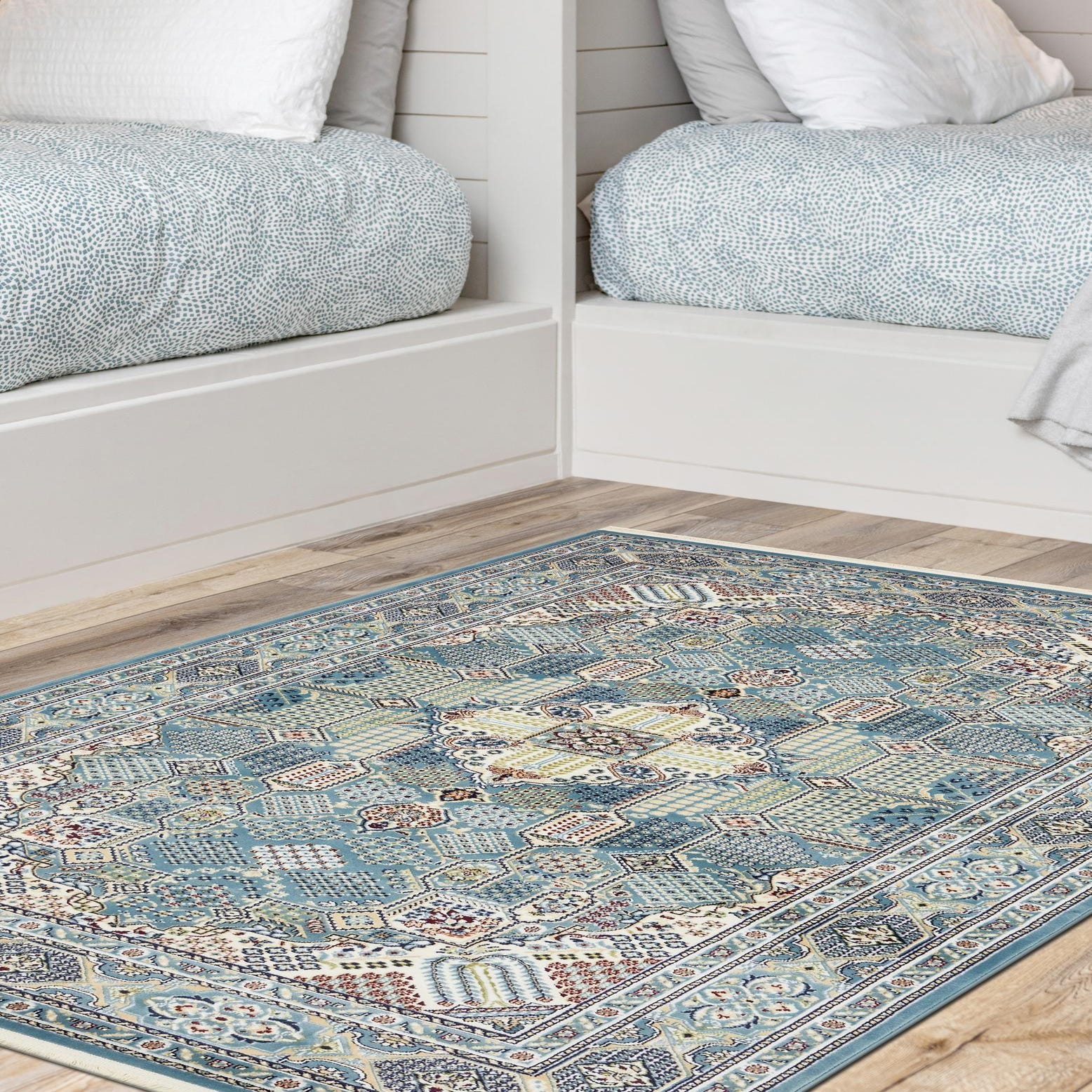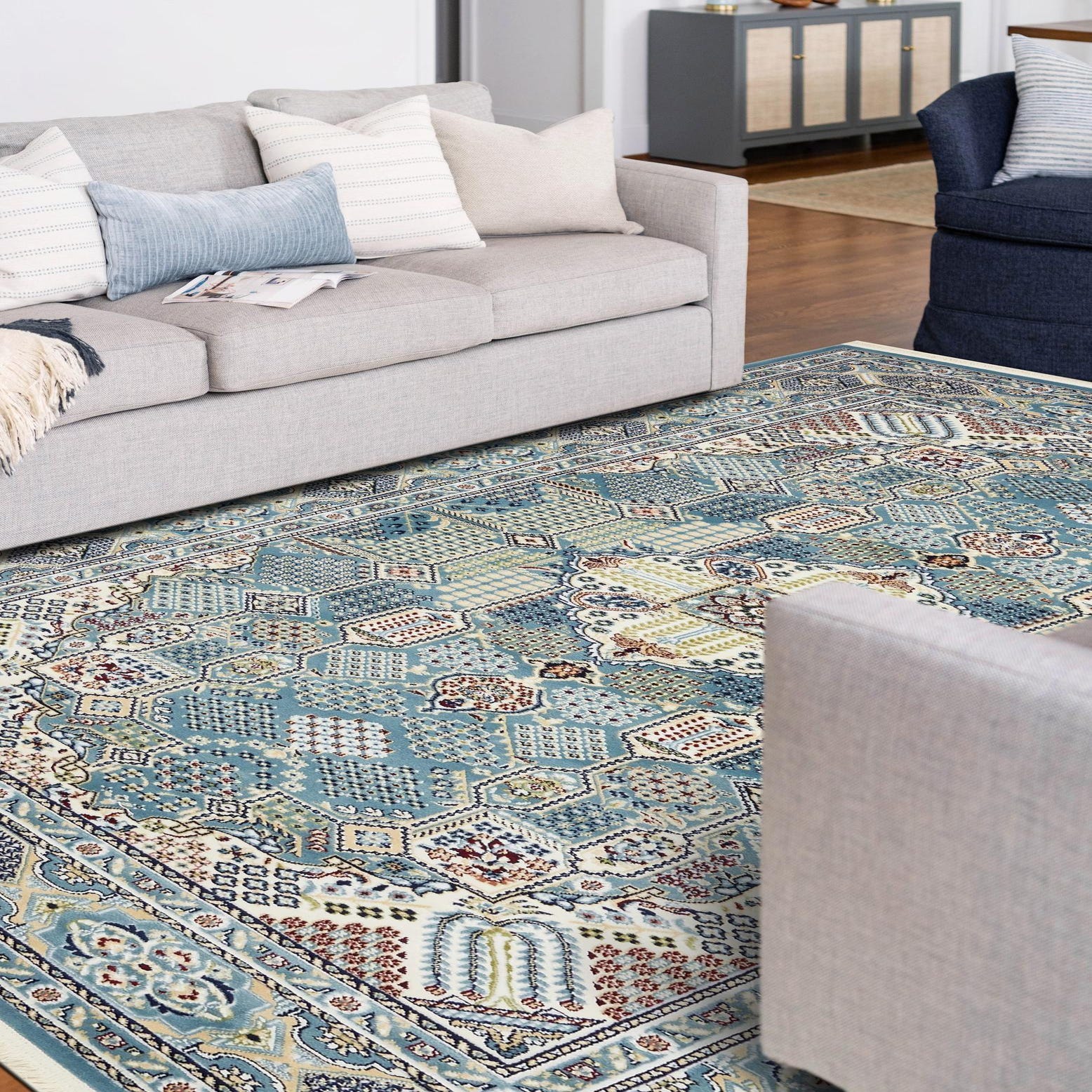 Primary color is Blue. Colors in this rug include: Blue, Beige, Burgundy, Cream, Green, Ivory, Navy Blue, Puce.