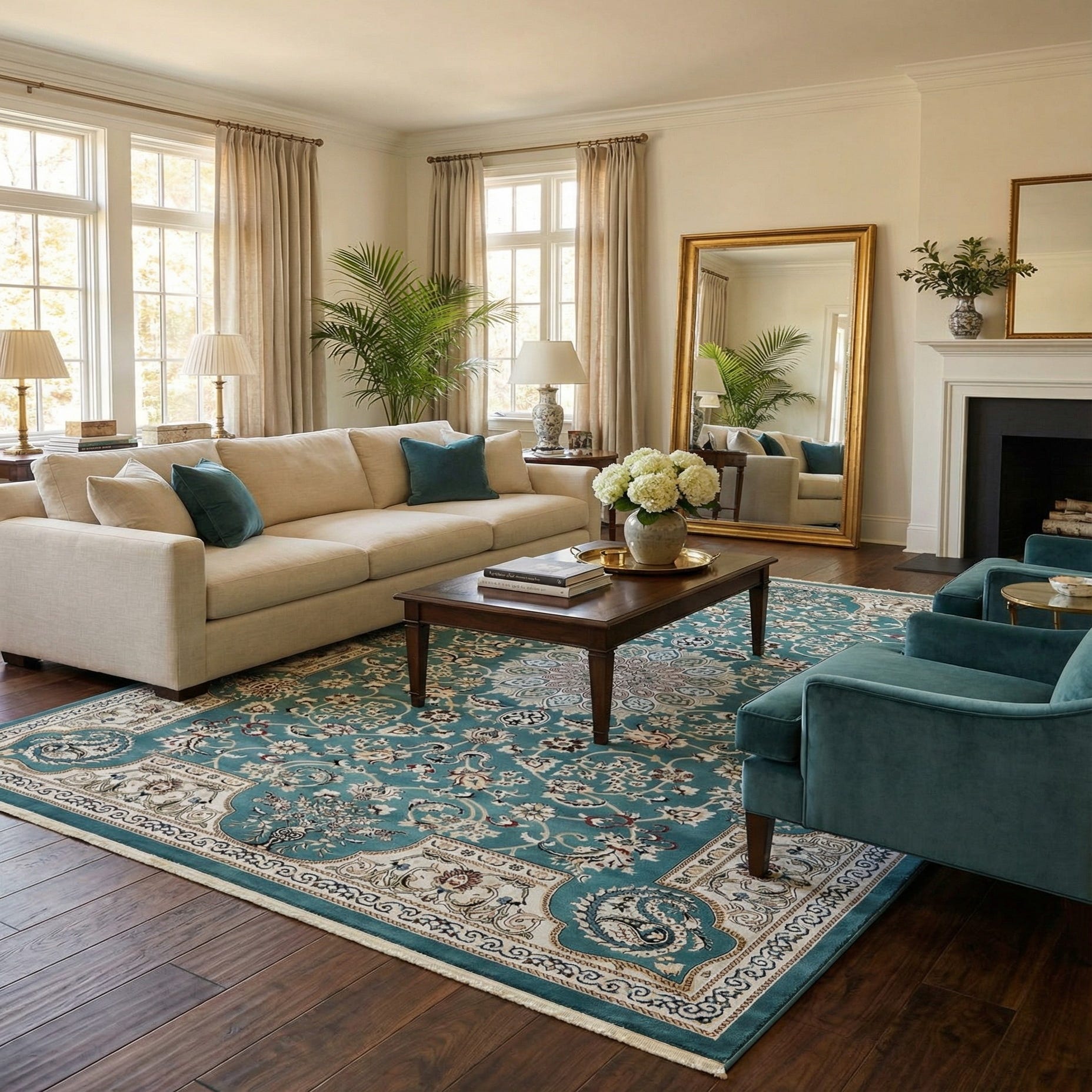 Primary color is Blue. Colors in this rug include: Blue, Beige, Burgundy, Cream, Green, Ivory, Navy Blue, Puce.