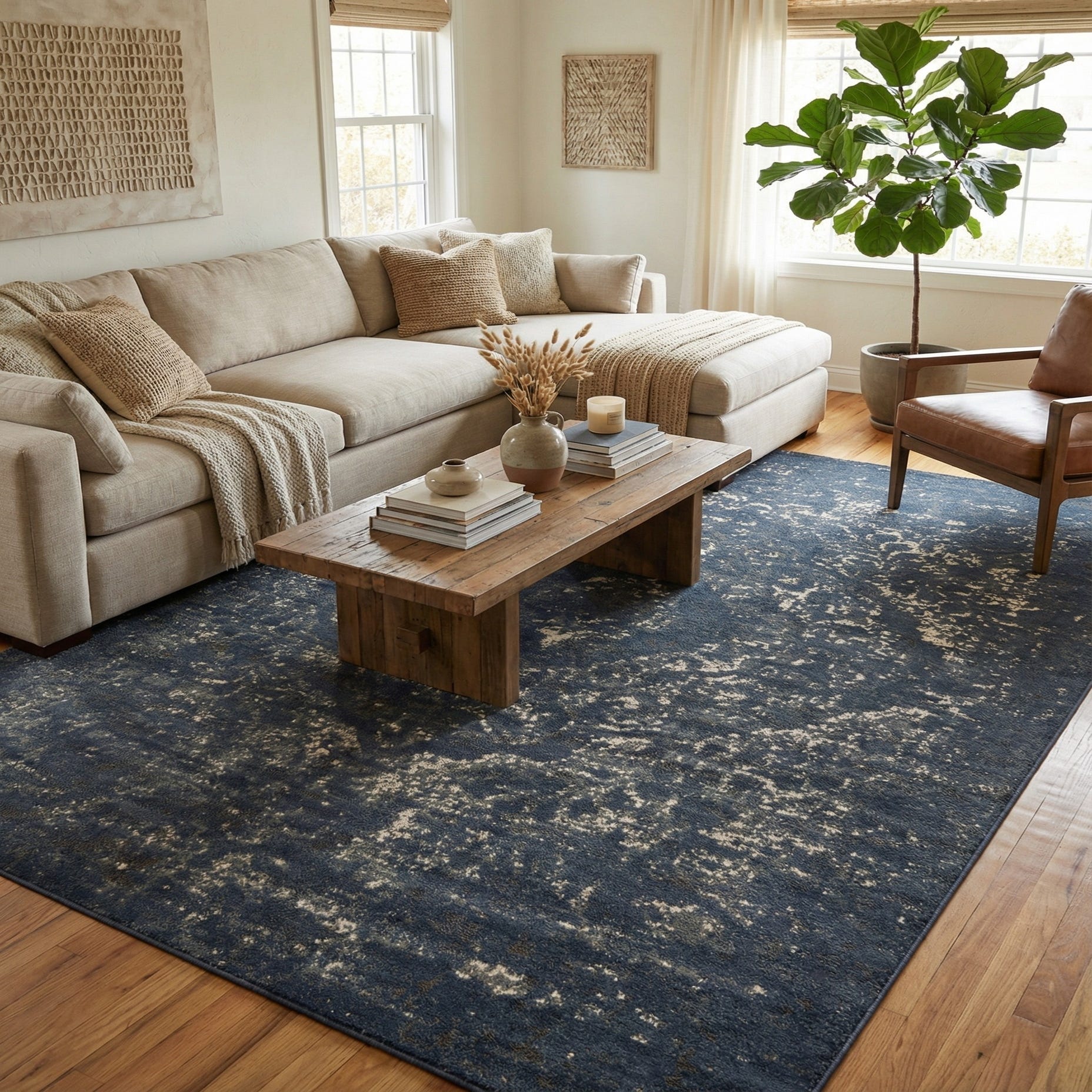 Primary color is Blue. Colors in this rug include: Blue, Gray, Ivory.