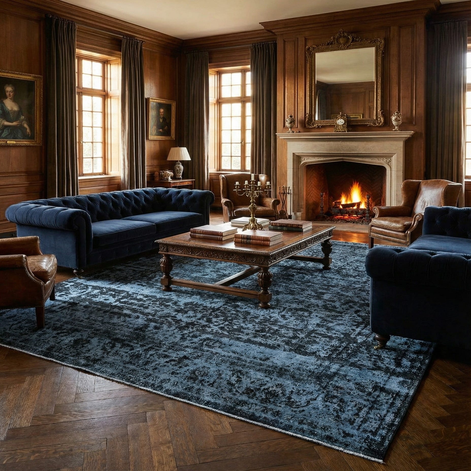 Primary color is Blue. Colors in this rug include: Blue, Black, Light Blue.