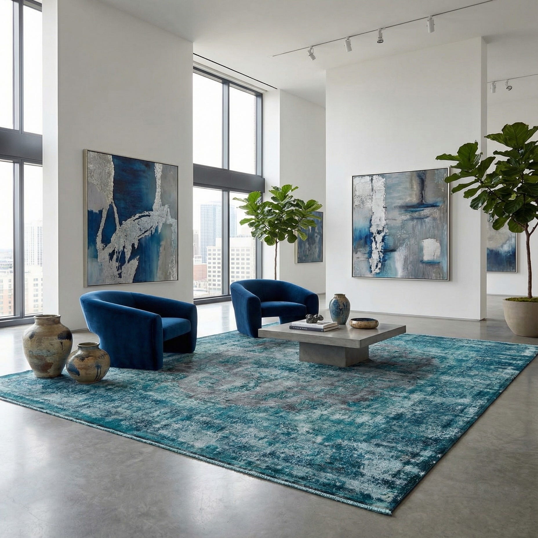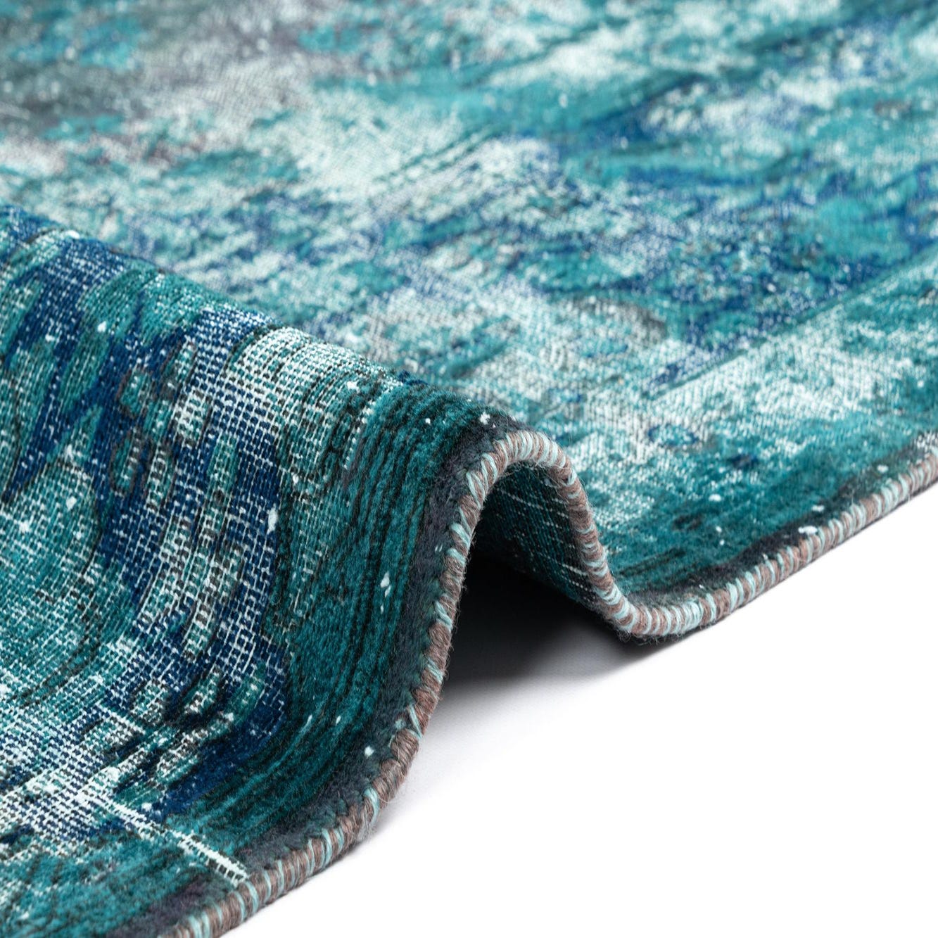 Primary color is Blue. Colors in this rug include: Blue, Green, Brown, Grey, Dark Blue.