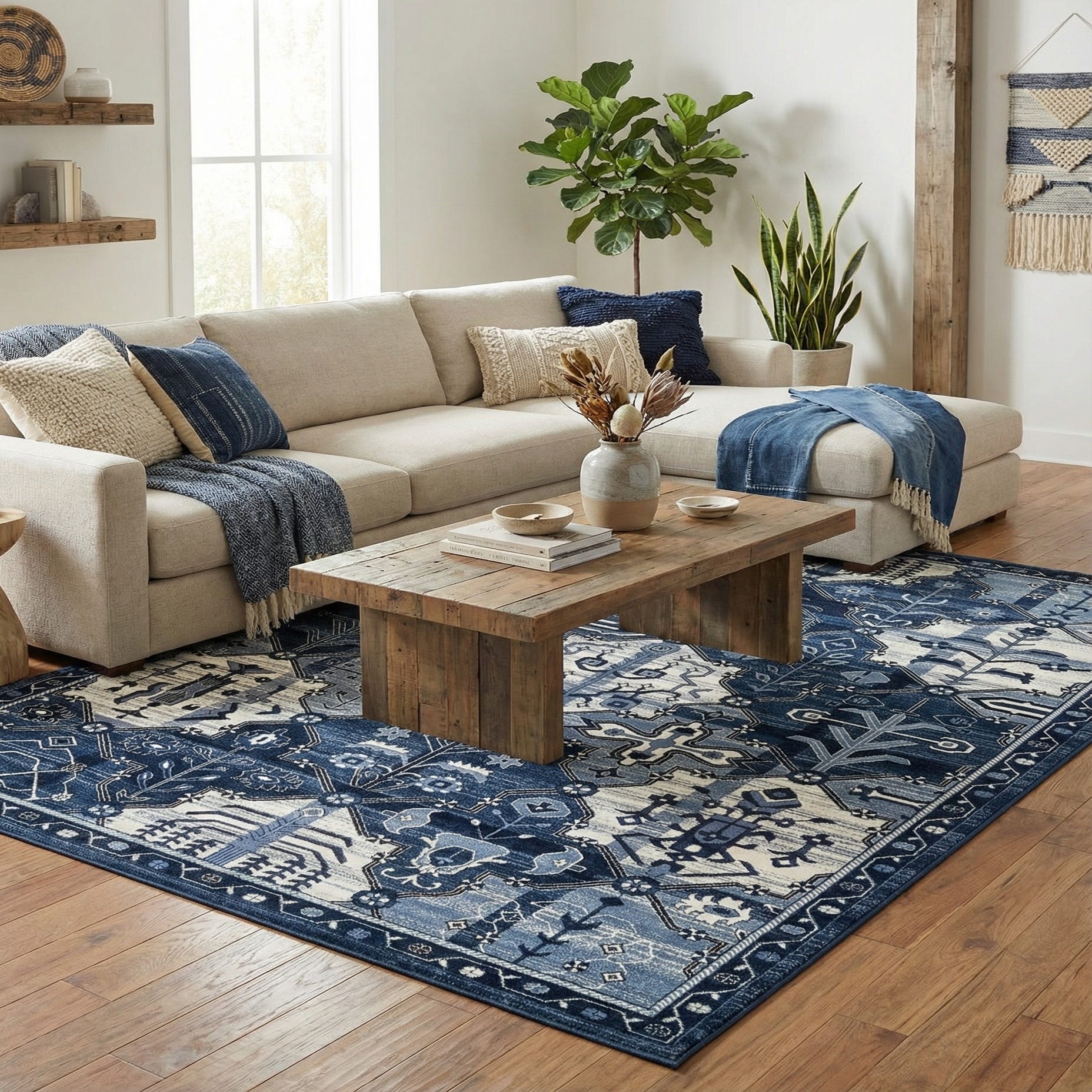 Primary color is Blue. Colors in this rug include: Blue, Ivory, Light Blue, Navy Blue.