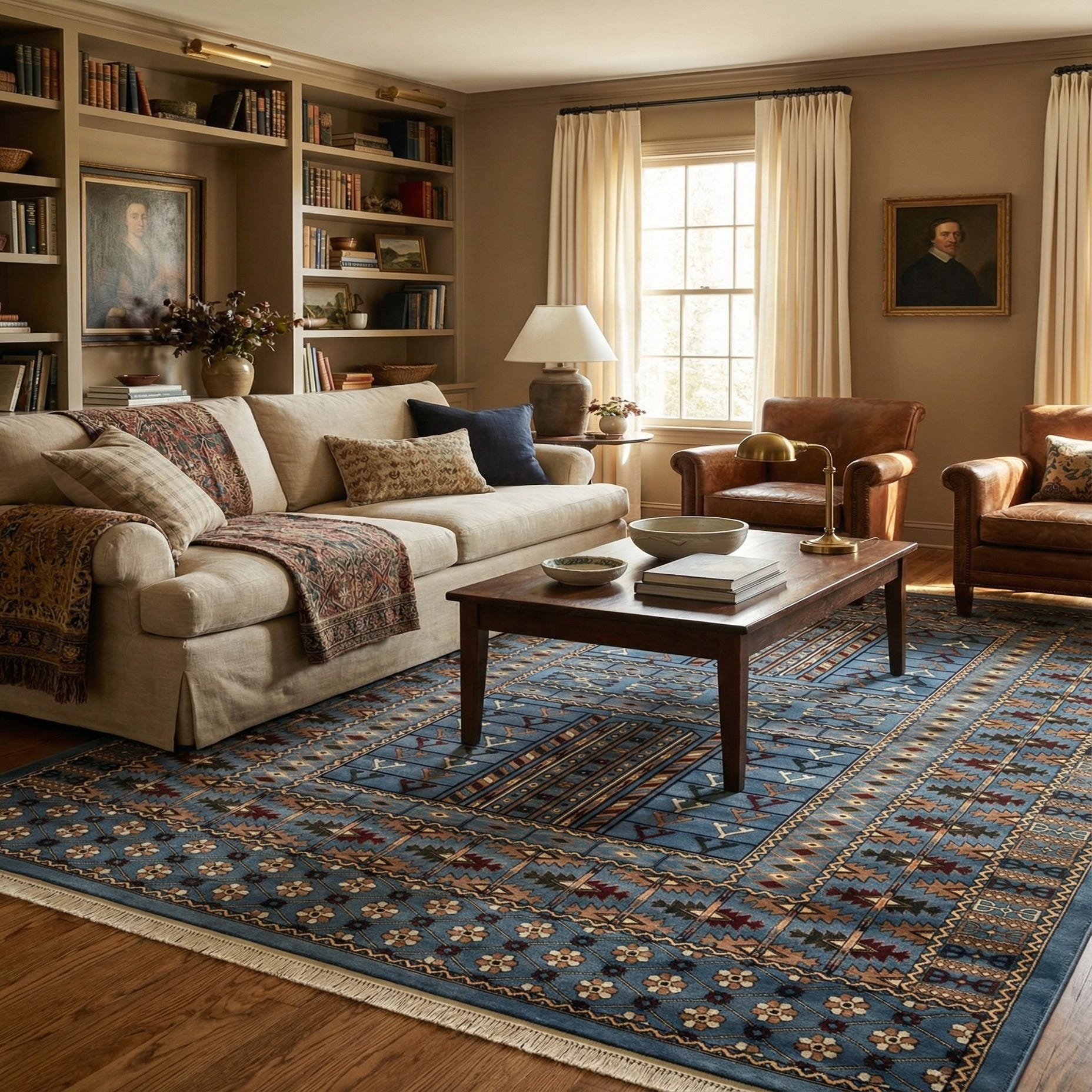 Primary color is Blue. Colors in this rug include: Blue, Beige, Black, Ivory, Light Brown, Red, Yellow.