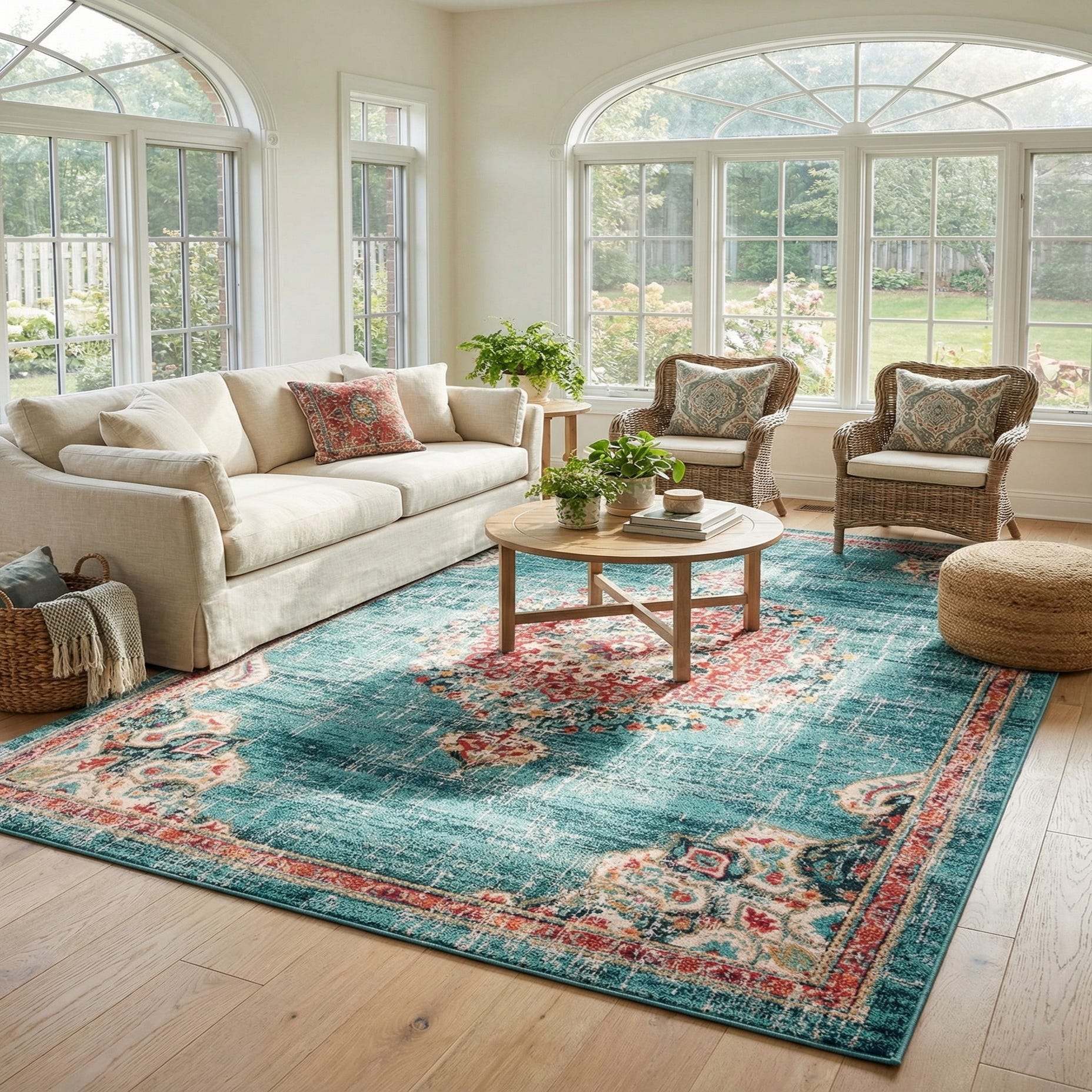 Primary color is Blue. Colors in this rug include: Blue, Gold, Green, Ivory, Navy Blue, Orange, Red, Pink.
