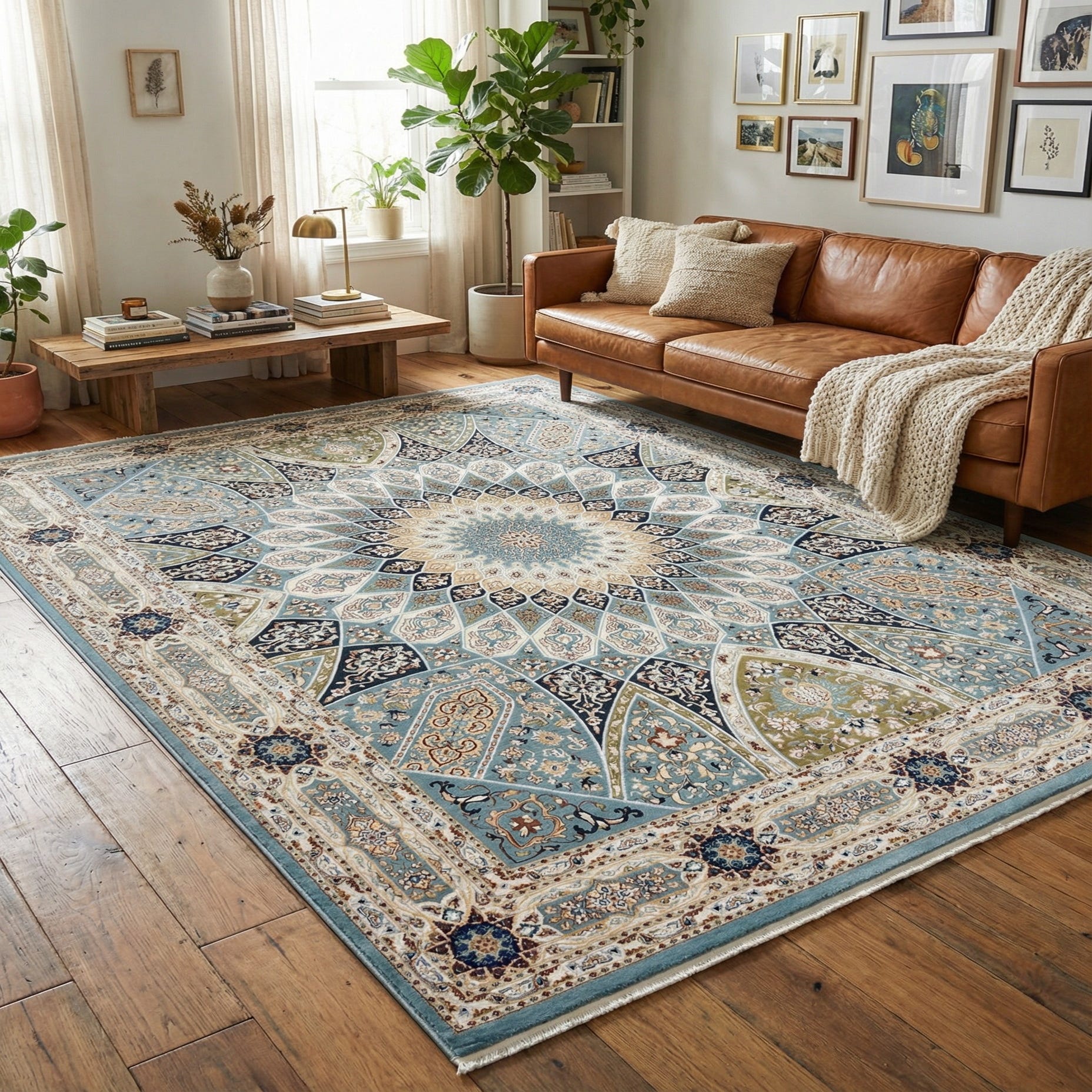Primary color is Blue. Colors in this rug include: Blue, Burgundy, Cream, Ivory, Light Blue, Light Green, Navy Blue, Puce.