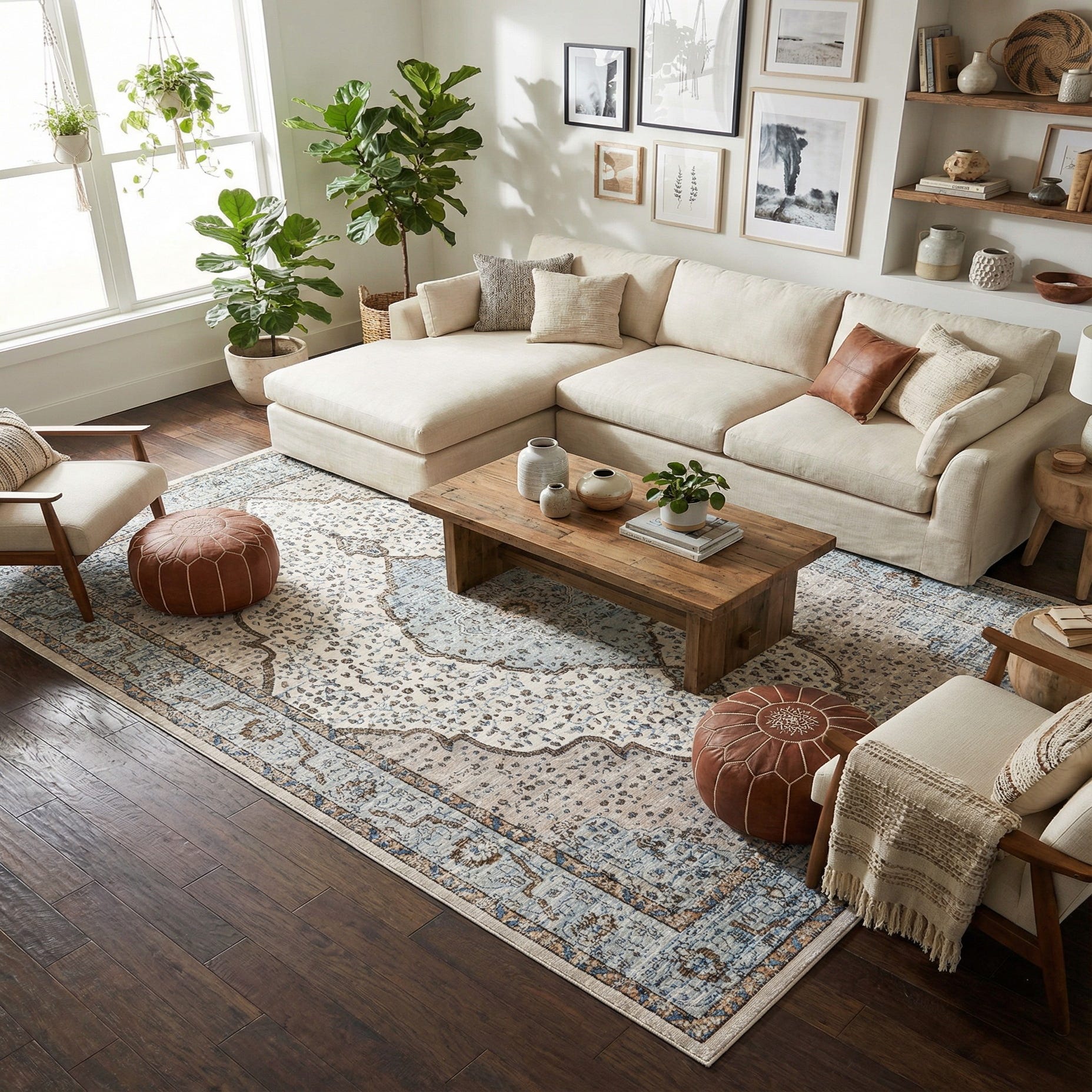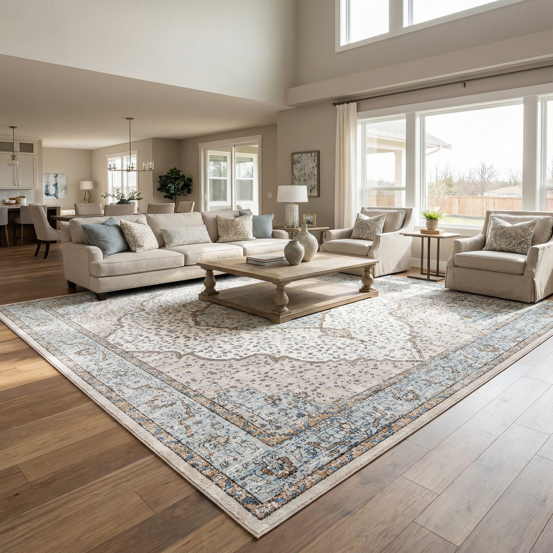 Primary color is Blue. Colors in this rug include: Blue, Beige, Brown, Light Blue, Gray, Ivory.