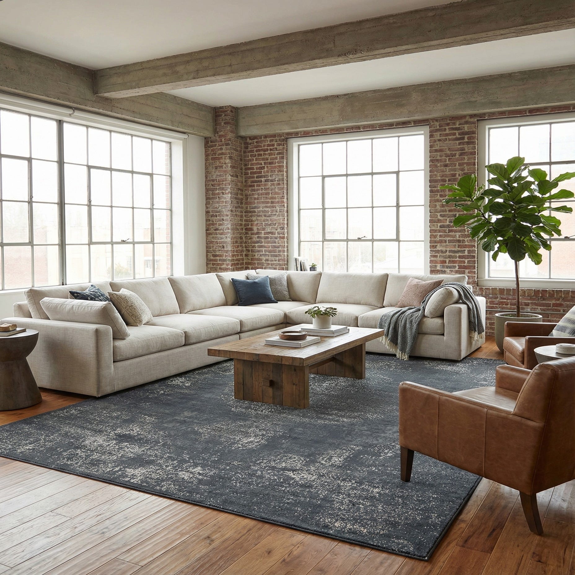 Primary color is Blue. Colors in this rug include: Blue, Gray, Ivory.