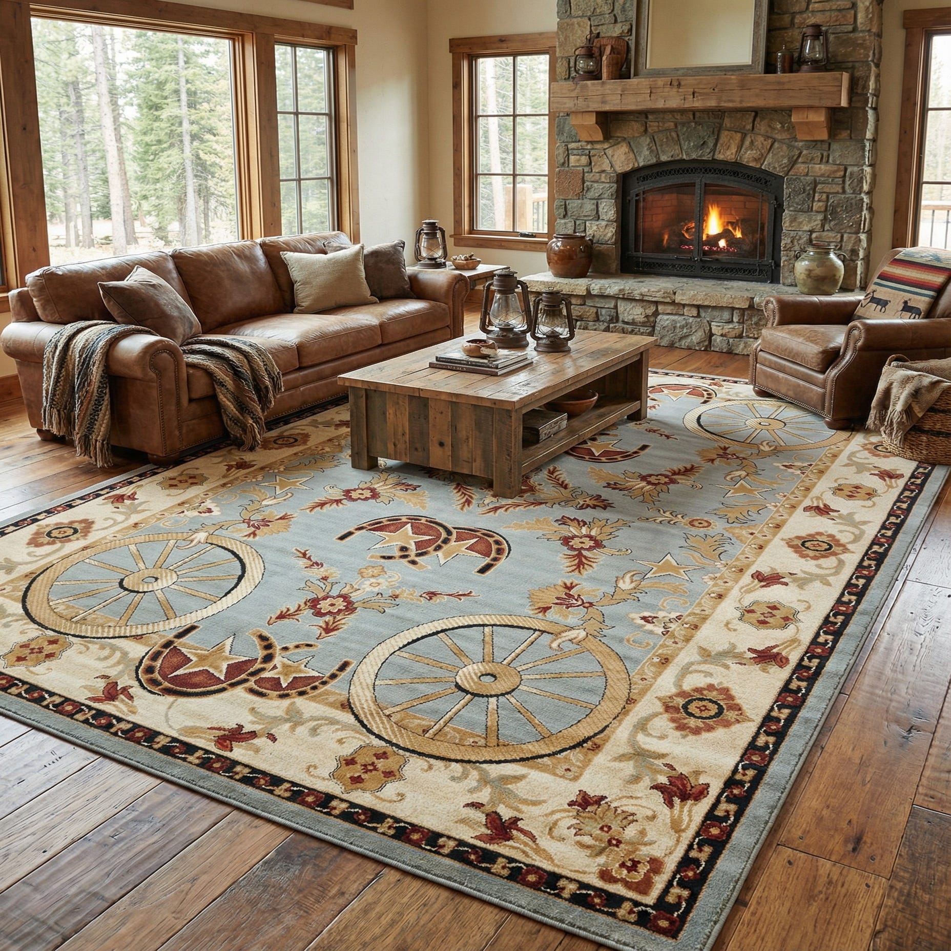 Primary color is Blue. Colors in this rug include: Blue, Beige, Black, Brown, Rust Red.