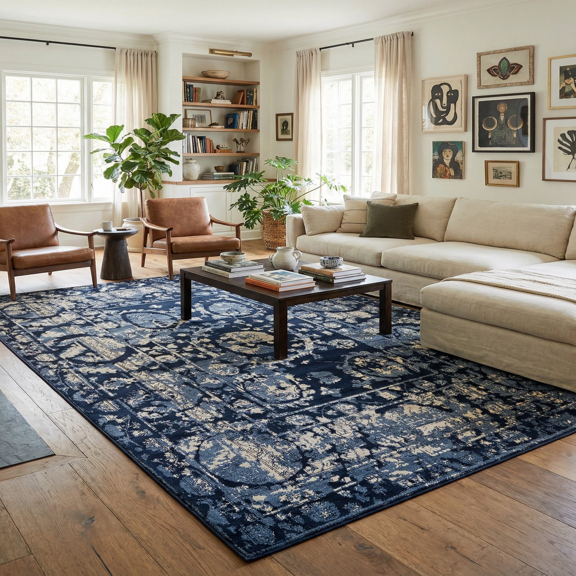 Primary color is Blue. Colors in this rug include: Blue, Ivory, Navy Blue, Light Blue.
