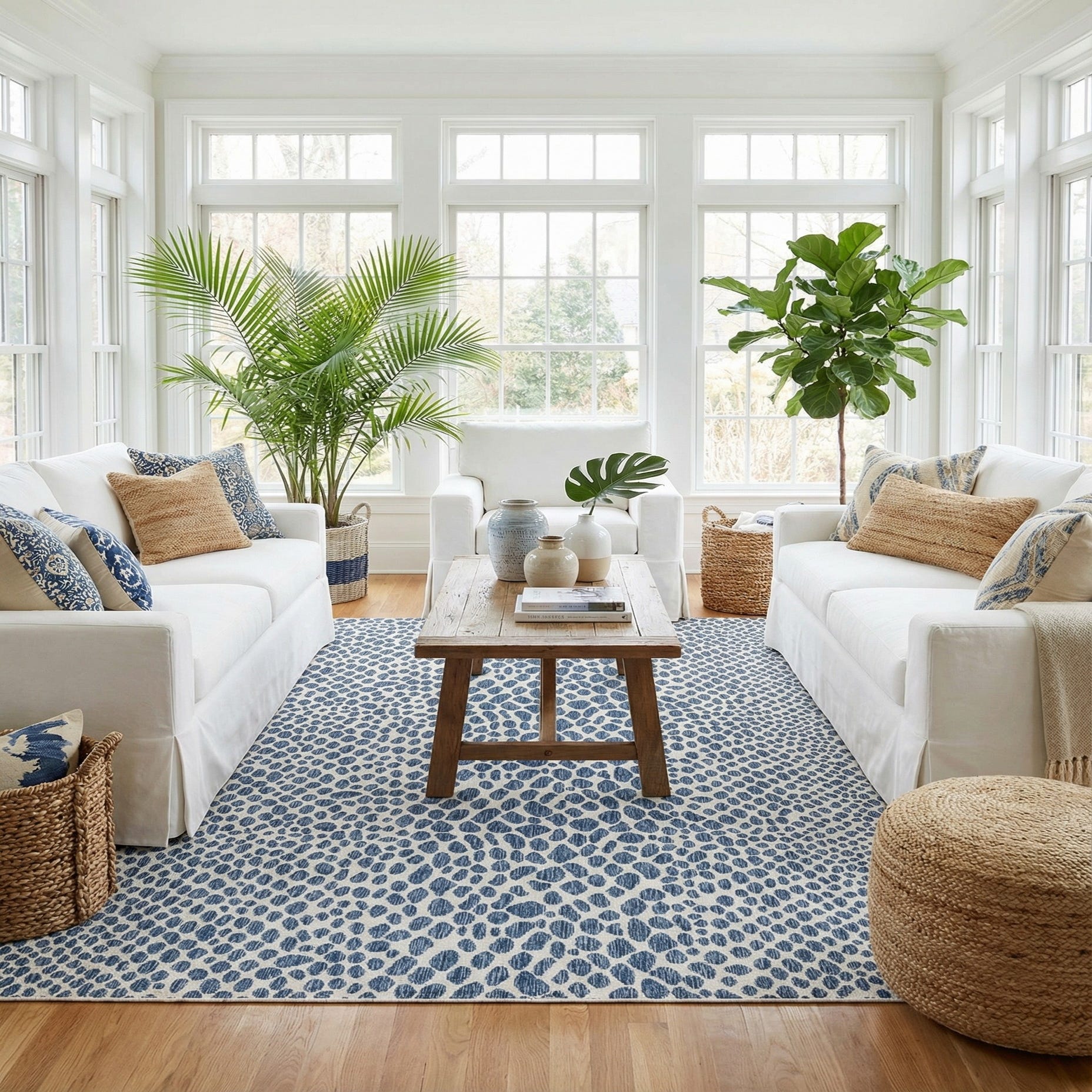 Primary color is Blue. Colors in this rug include: Blue, Ivory.