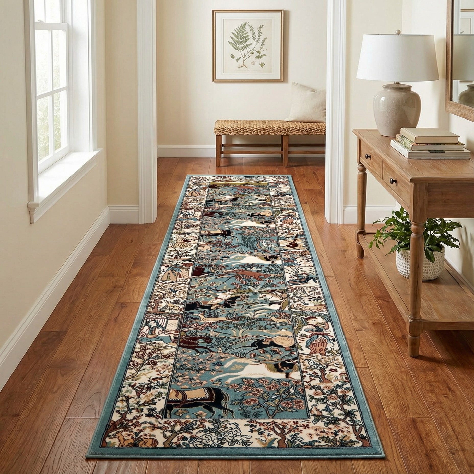 Primary color is Blue. Colors in this rug include: Blue, Black, Burgundy, Cream, Green, Ivory, Navy Blue, Plum Red, Tan.