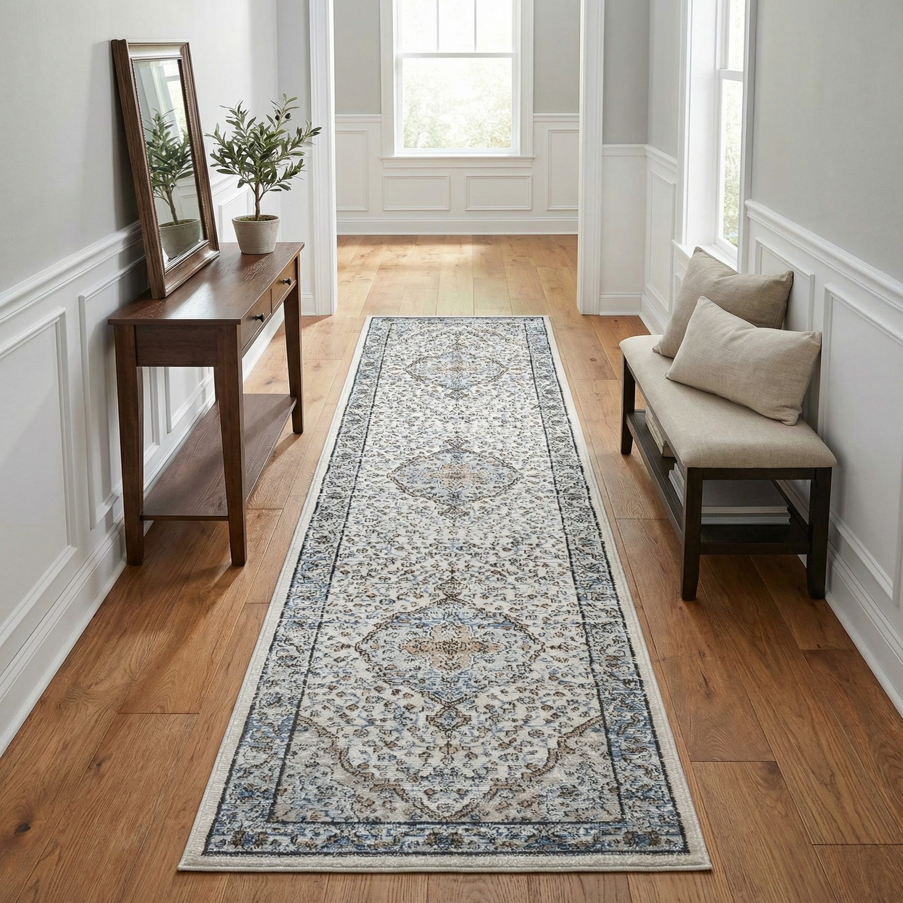 Primary color is Blue. Colors in this rug include: Blue, Beige, Brown, Ivory, Gray, Light Blue.