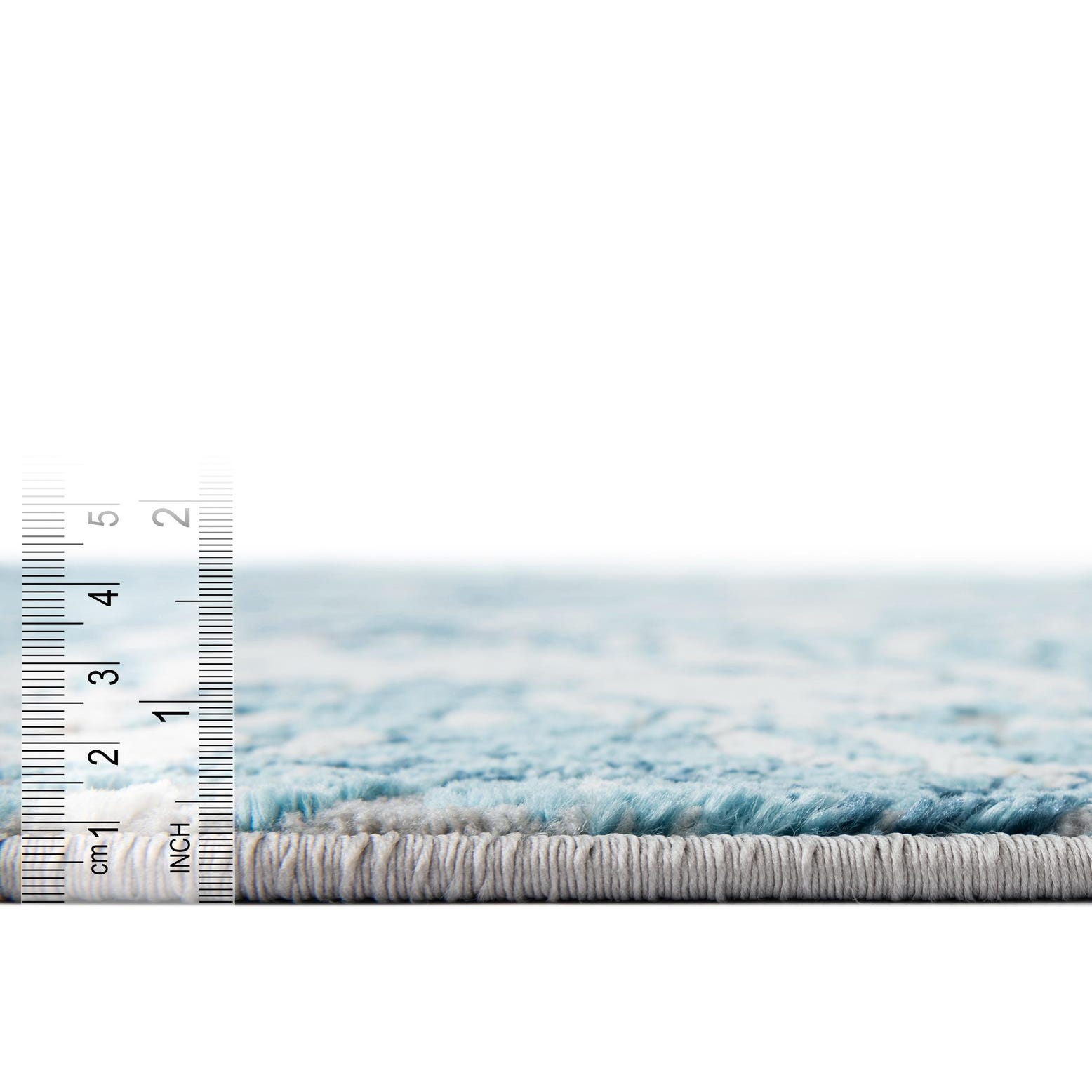Primary color is Blue. Colors in this rug include: Blue, Gray, Navy Blue, Ivory.
