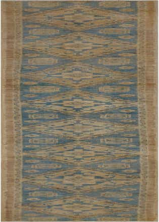 Primary color is Blue. Colors in this rug include: Blue, Brown, Beige.