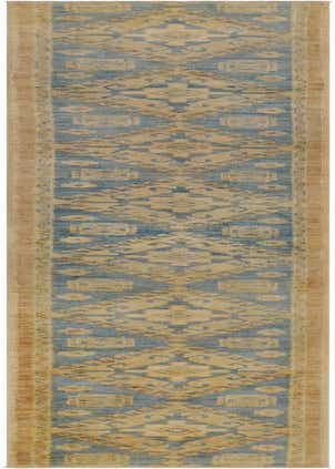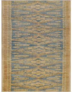 Primary color is Blue. Colors in this rug include: Blue, Beige, Brown.