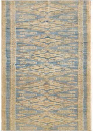 Primary color is Blue. Colors in this rug include: Blue, Brown, Beige.
