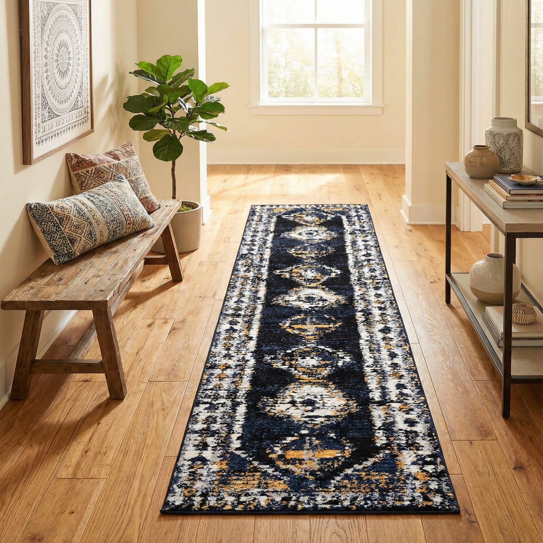 Primary color is Blue. Colors in this rug include: Blue, Black, Ivory, Gray, Navy Blue, Yellow.