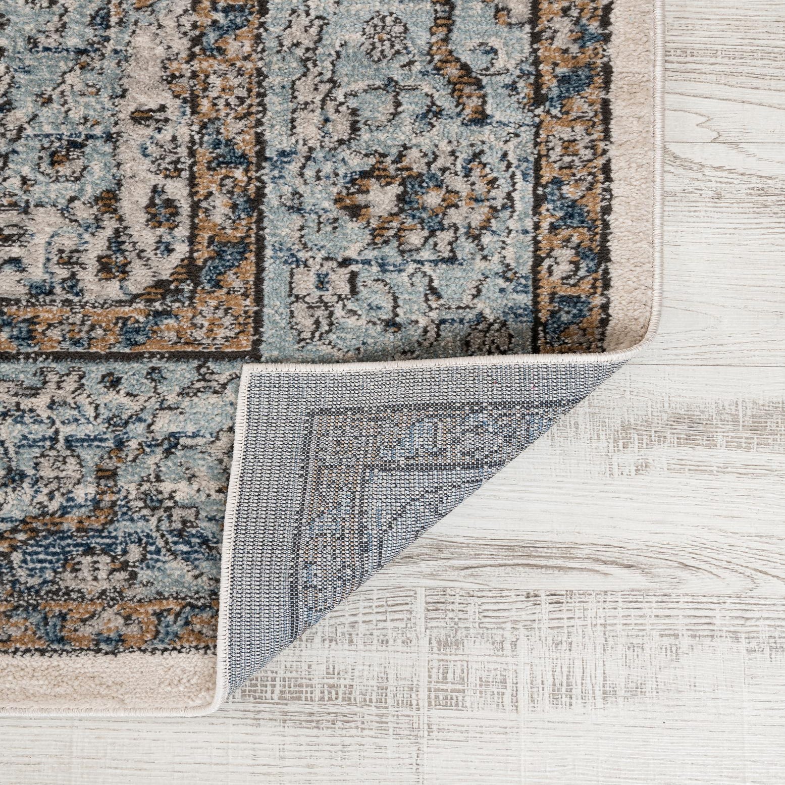 Primary color is Blue. Colors in this rug include: Blue, Brown, Gray, Rust Red, Ivory, Light Blue.