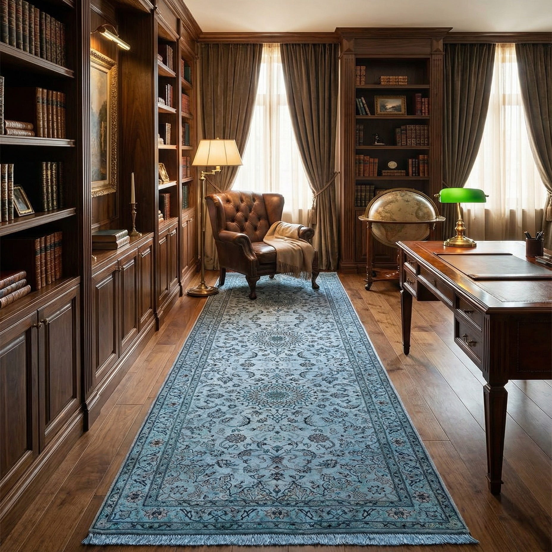 Primary color is Blue. Colors in this rug include: Blue, Blue, Dark Blue, Brown, Grey.