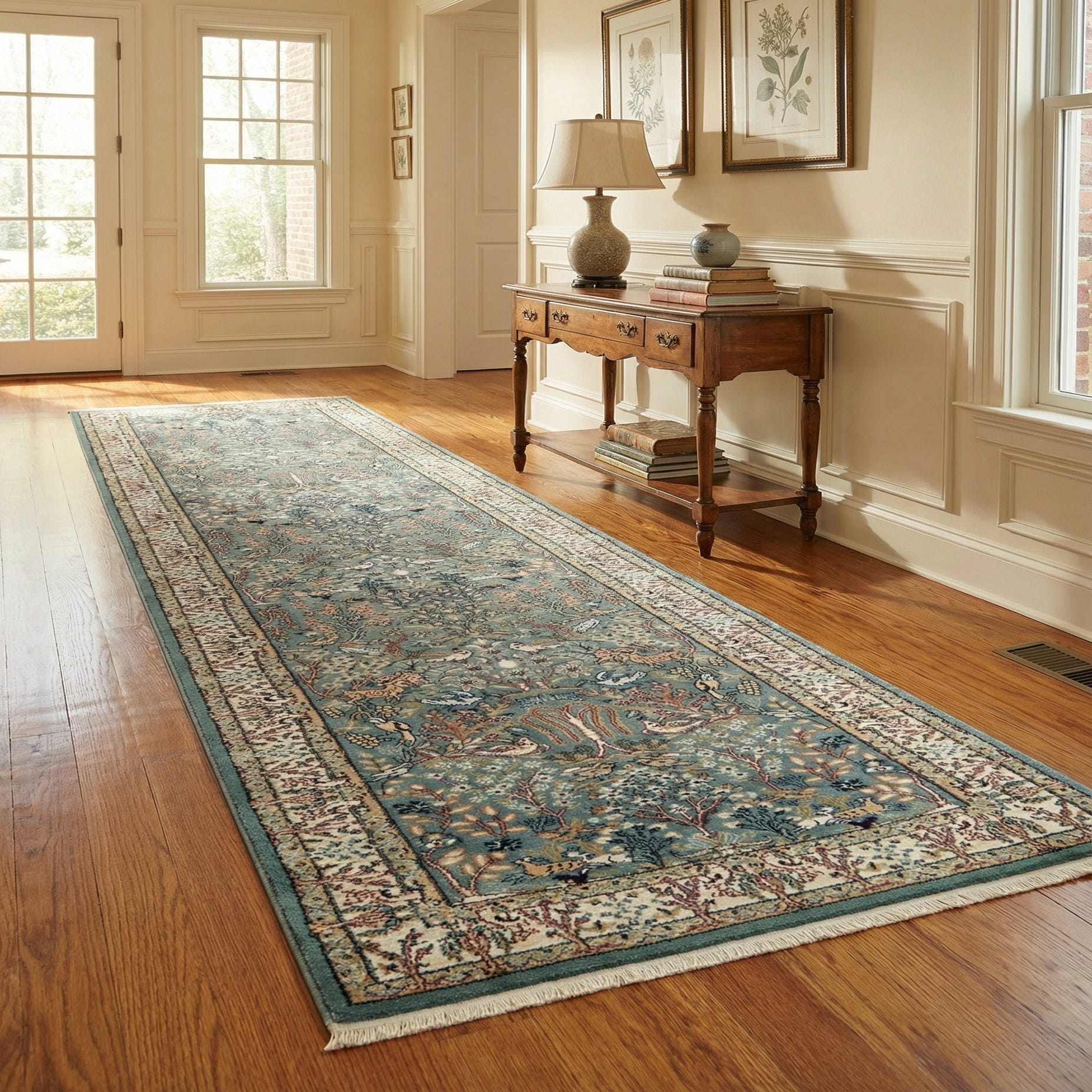 Primary color is Blue. Colors in this rug include: Blue, Beige, Burgundy, Cream, Green, Ivory, Navy Blue, Puce.
