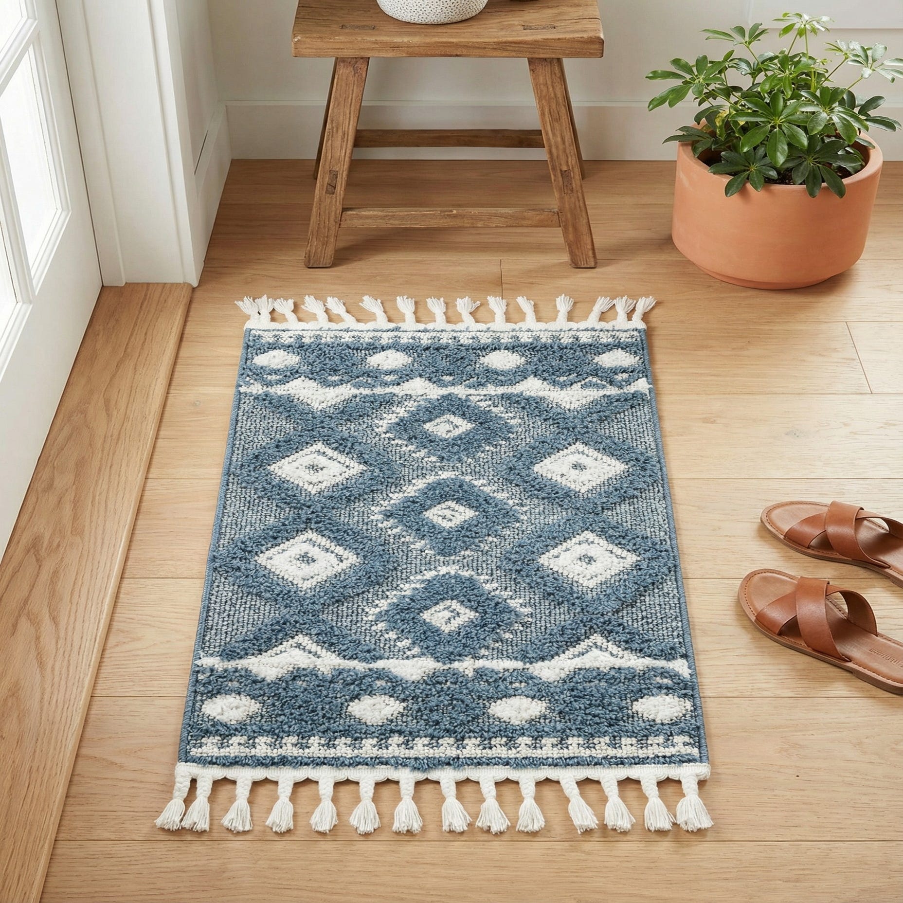 Primary color is Blue. Colors in this rug include: Blue, Ivory.