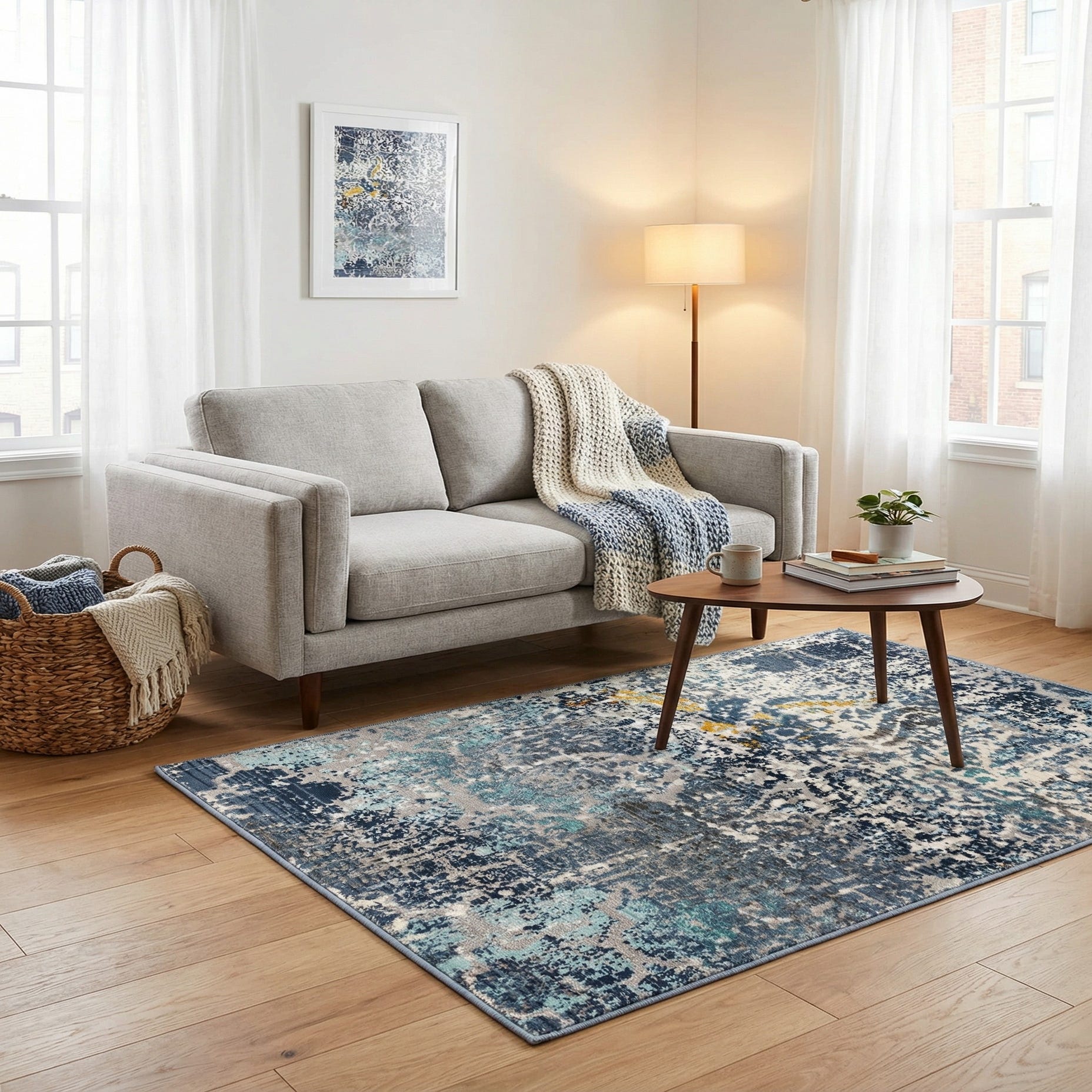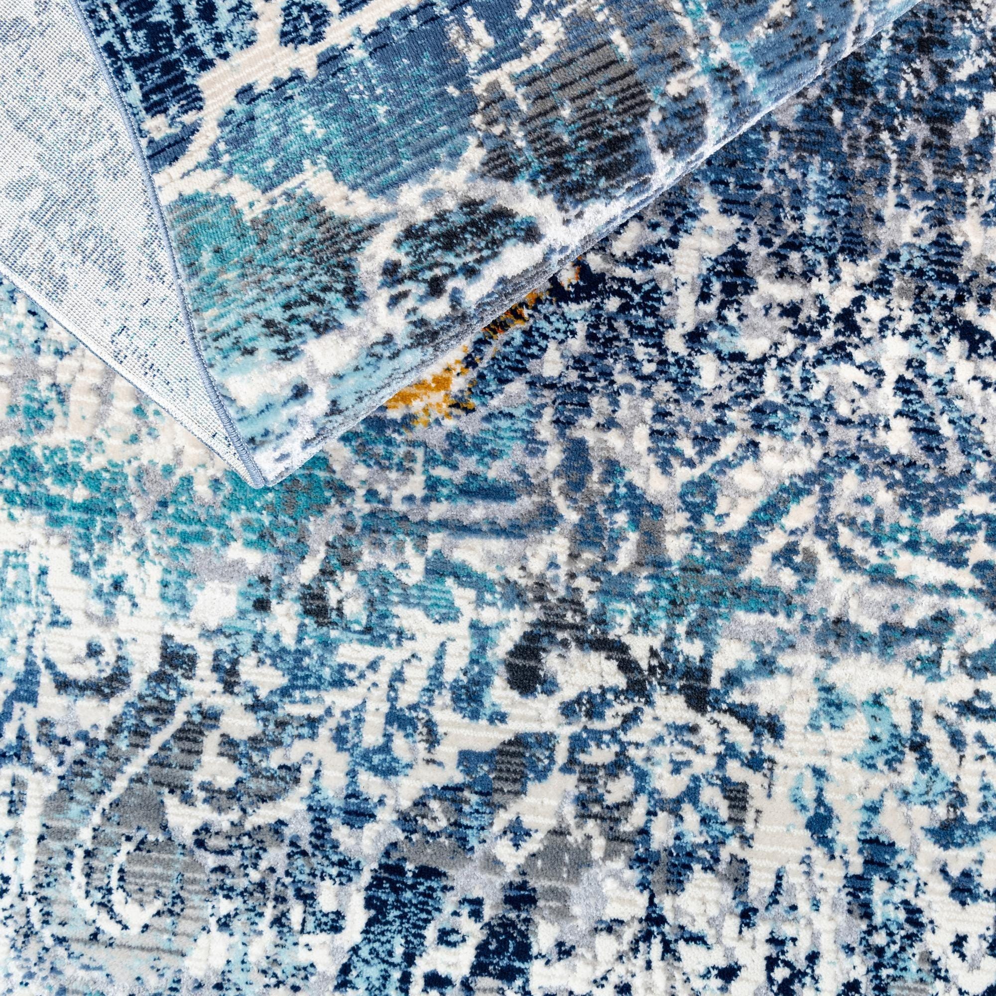 Primary color is Blue. Colors in this rug include: Blue, Gold, Gray, Ivory, Navy Blue, Light Blue.