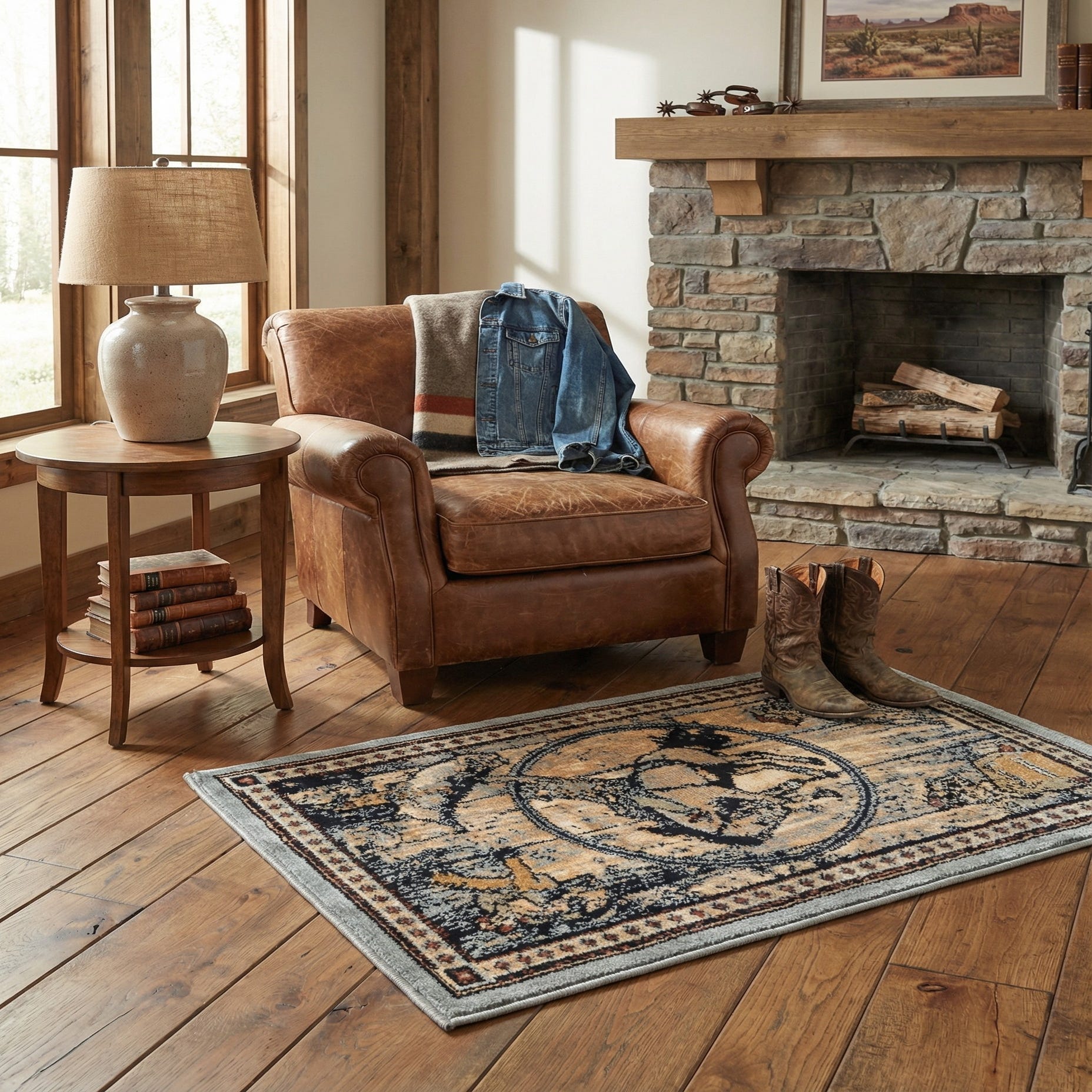 Primary color is Blue. Colors in this rug include: Blue, Beige, Black, Brown.