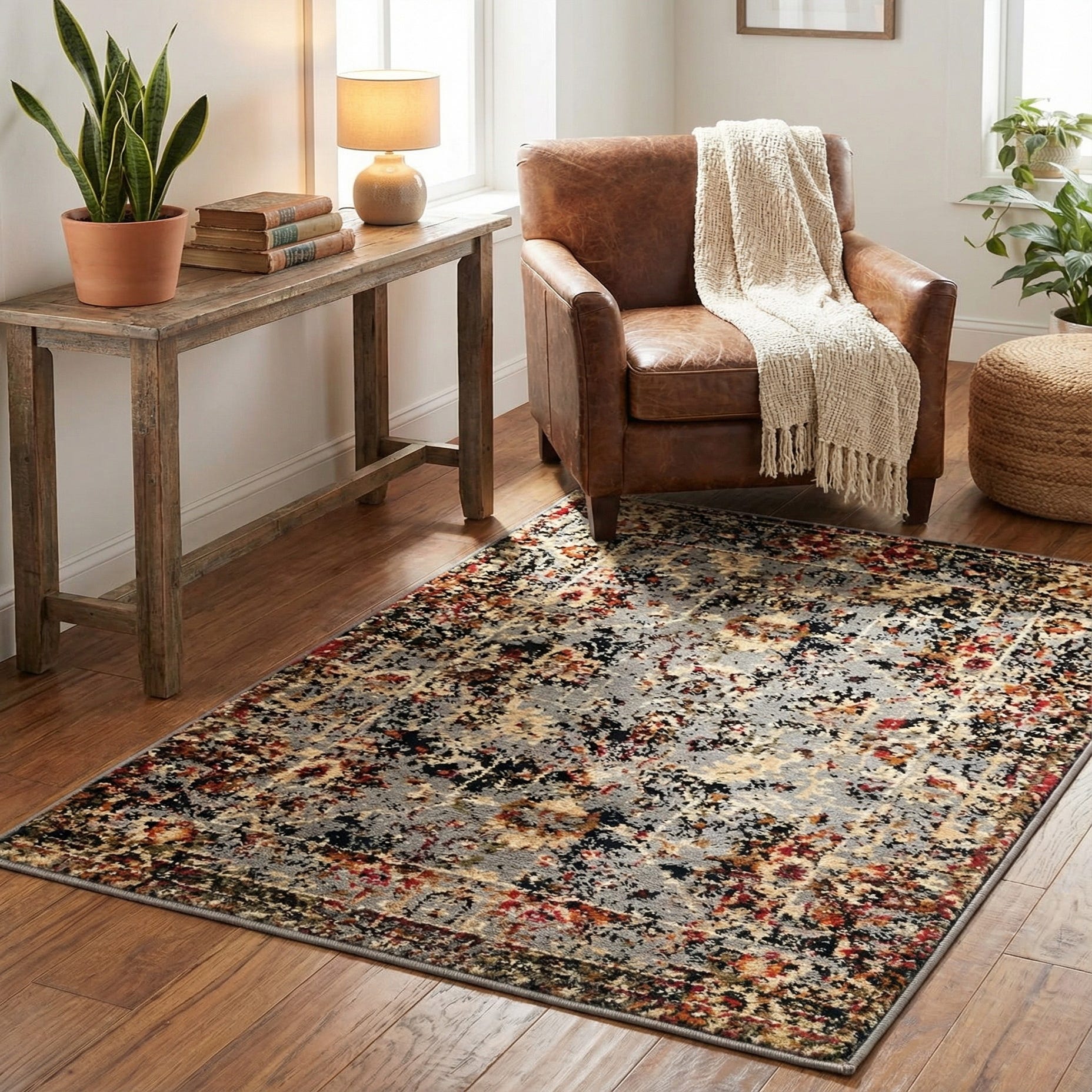 Primary color is Blue. Colors in this rug include: Blue, Beige, Black, Brown, Red, Tan.