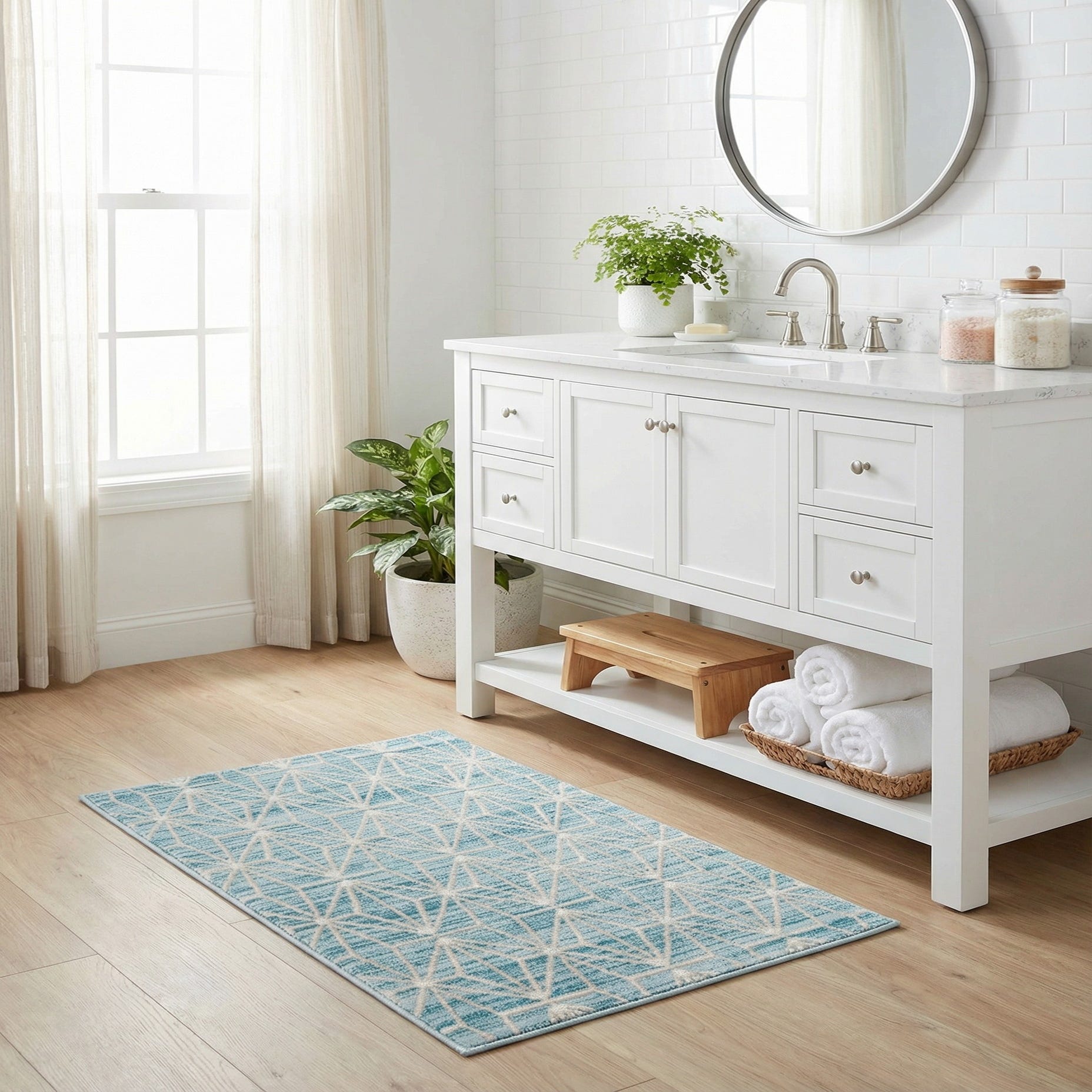 Primary color is Blue. Colors in this rug include: Blue, Beige, Ivory.