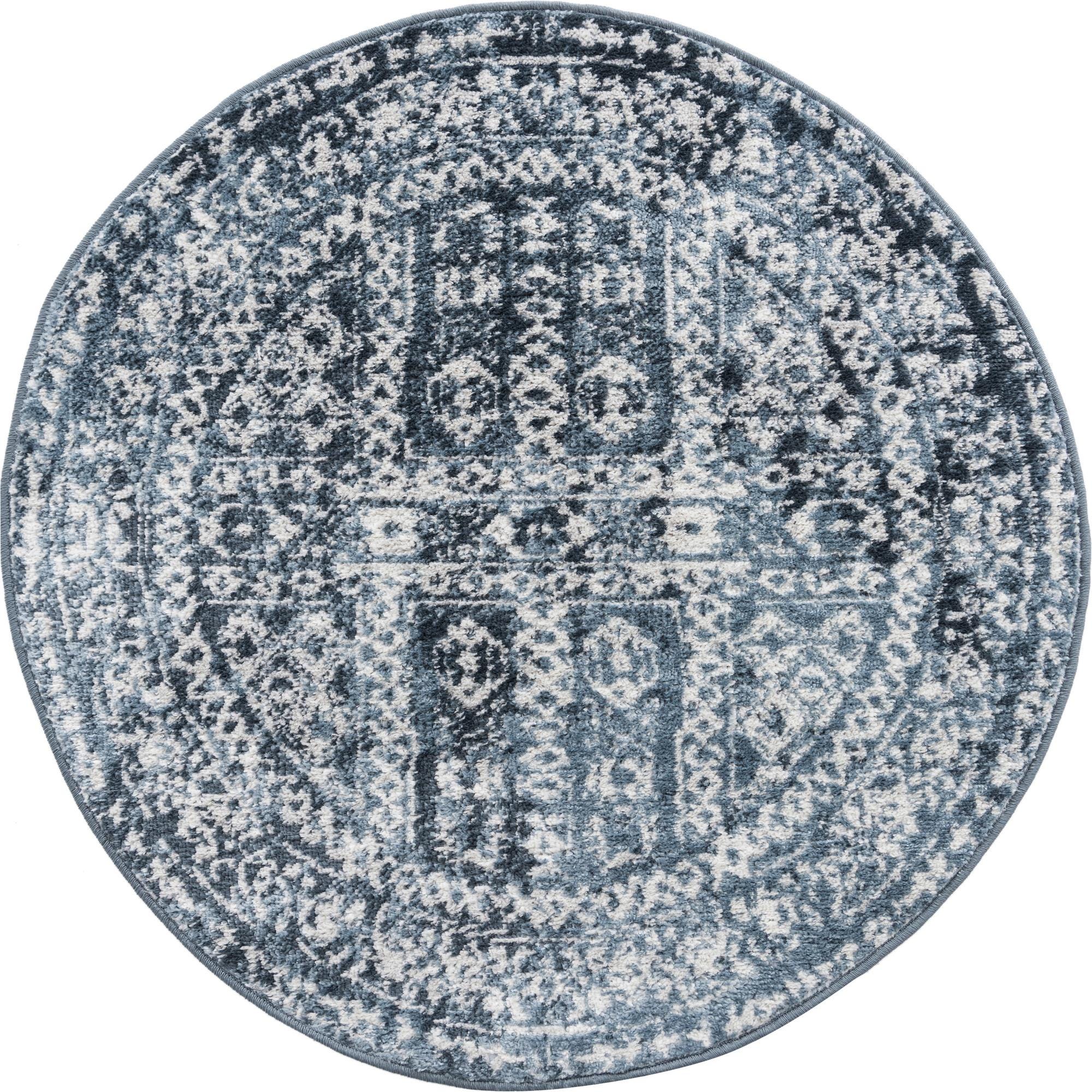 Primary color is Blue. Colors in this rug include: Blue, Ivory, Gray.