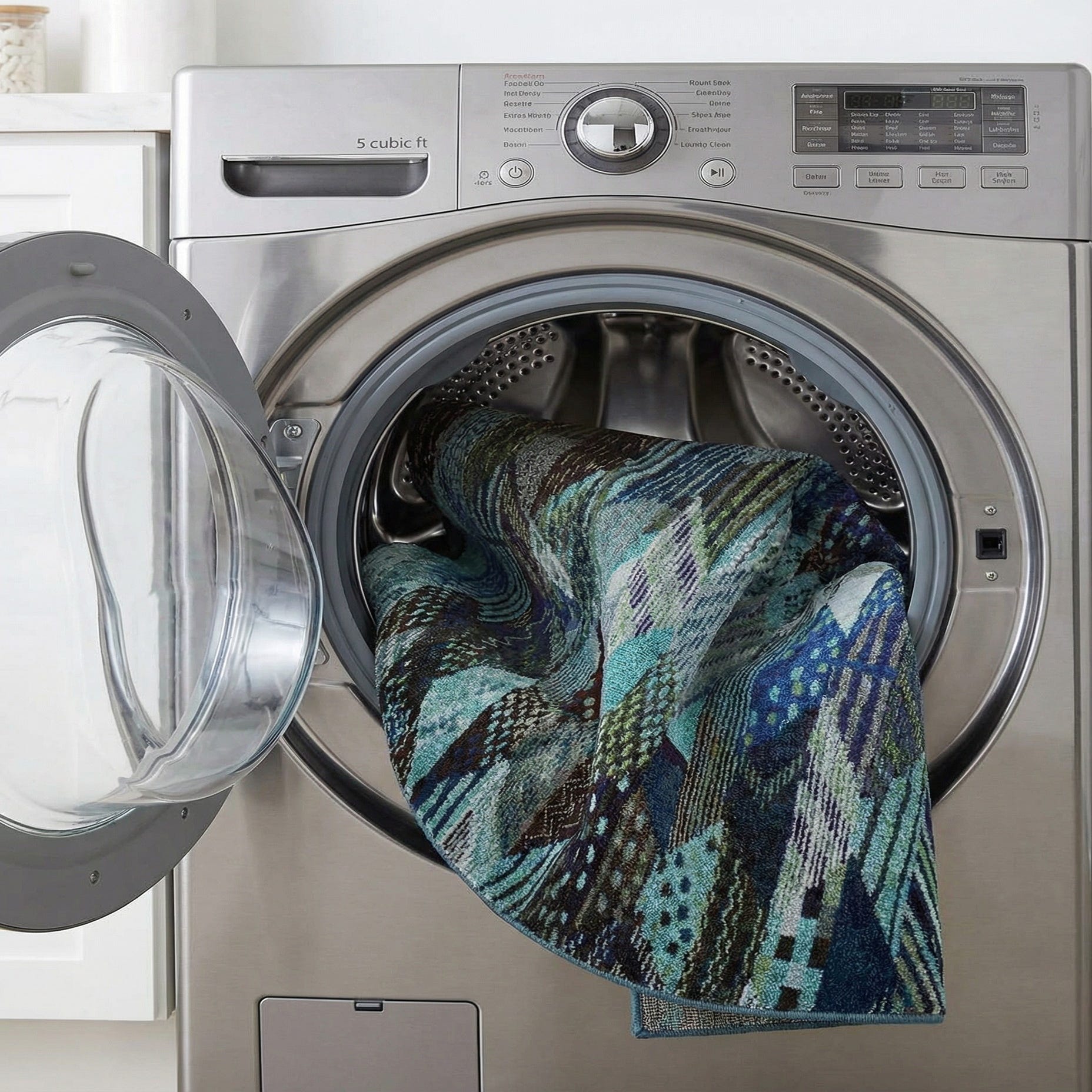 Primary color is Blue. Colors in this rug include: Blue, Gray, Green, Light Blue, Navy Blue.