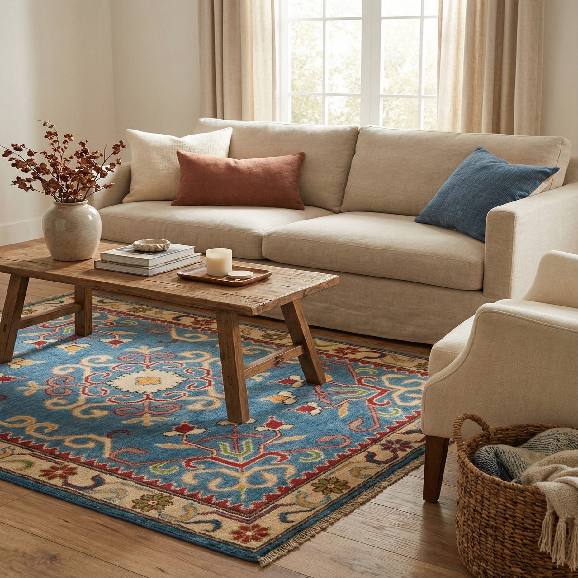 Primary color is Blue. Colors in this rug include: Blue, Brown, Cream, Green, Yellow, Red.