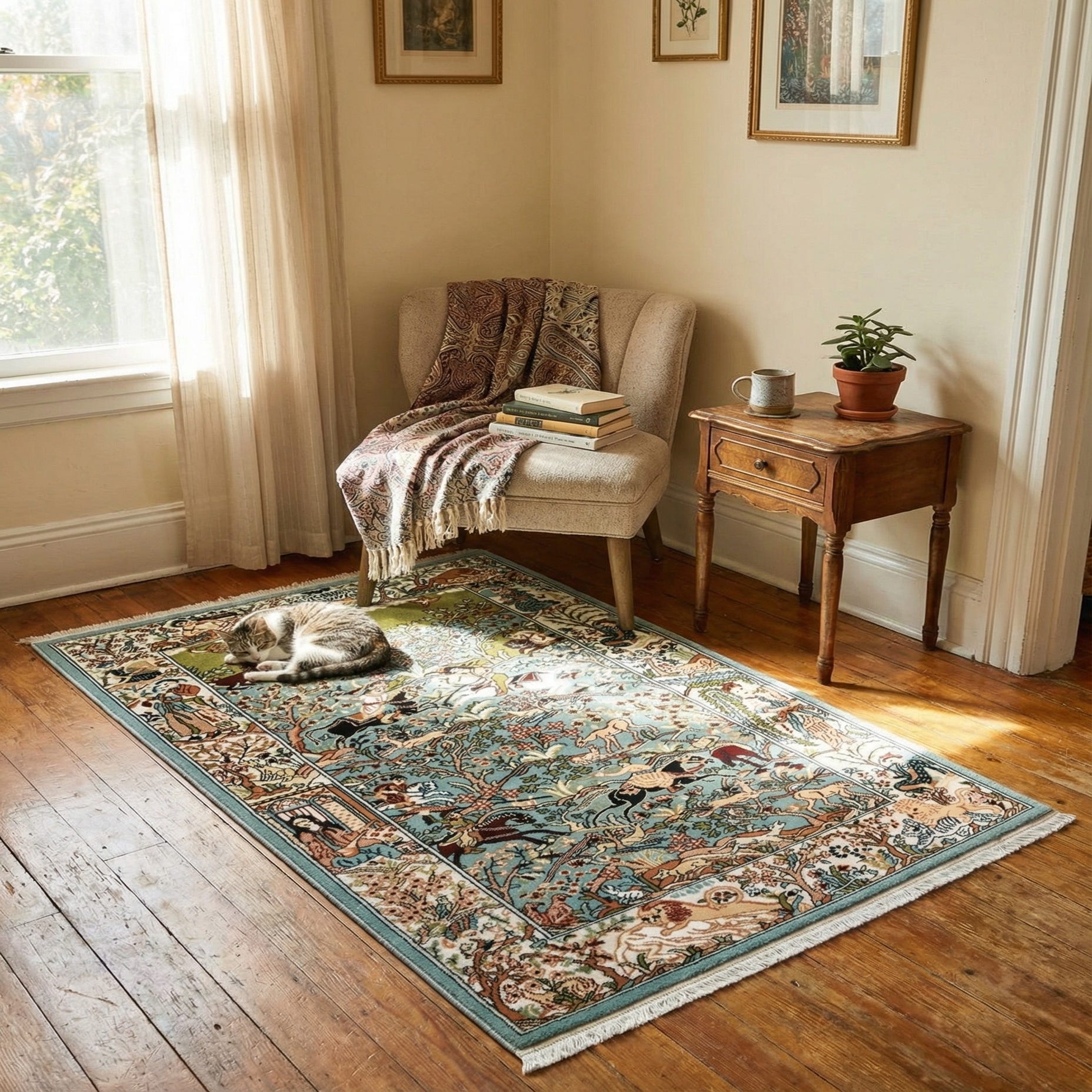 Primary color is Blue. Colors in this rug include: Blue, Black, Burgundy, Cream, Green, Ivory, Navy Blue, Tan, Plum Red.
