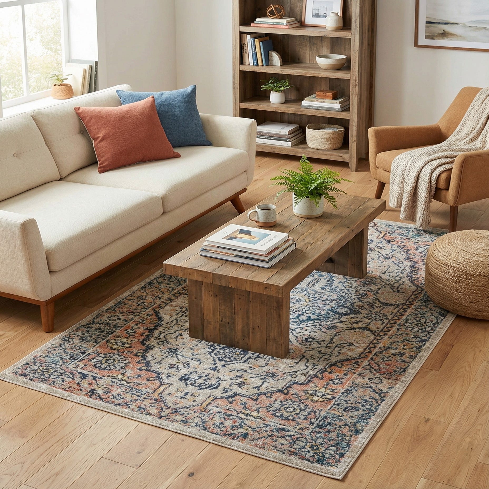 Primary color is Blue. Colors in this rug include: Blue, Gray, Ivory, Light Blue, Navy Blue, Yellow, Pink, Rust Red.