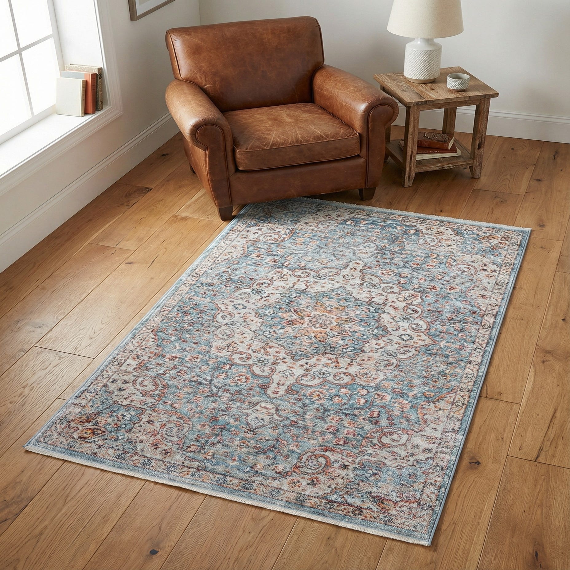 Primary color is Blue. Colors in this rug include: Blue, Ivory, Light Blue, Rust Red, Terracotta.