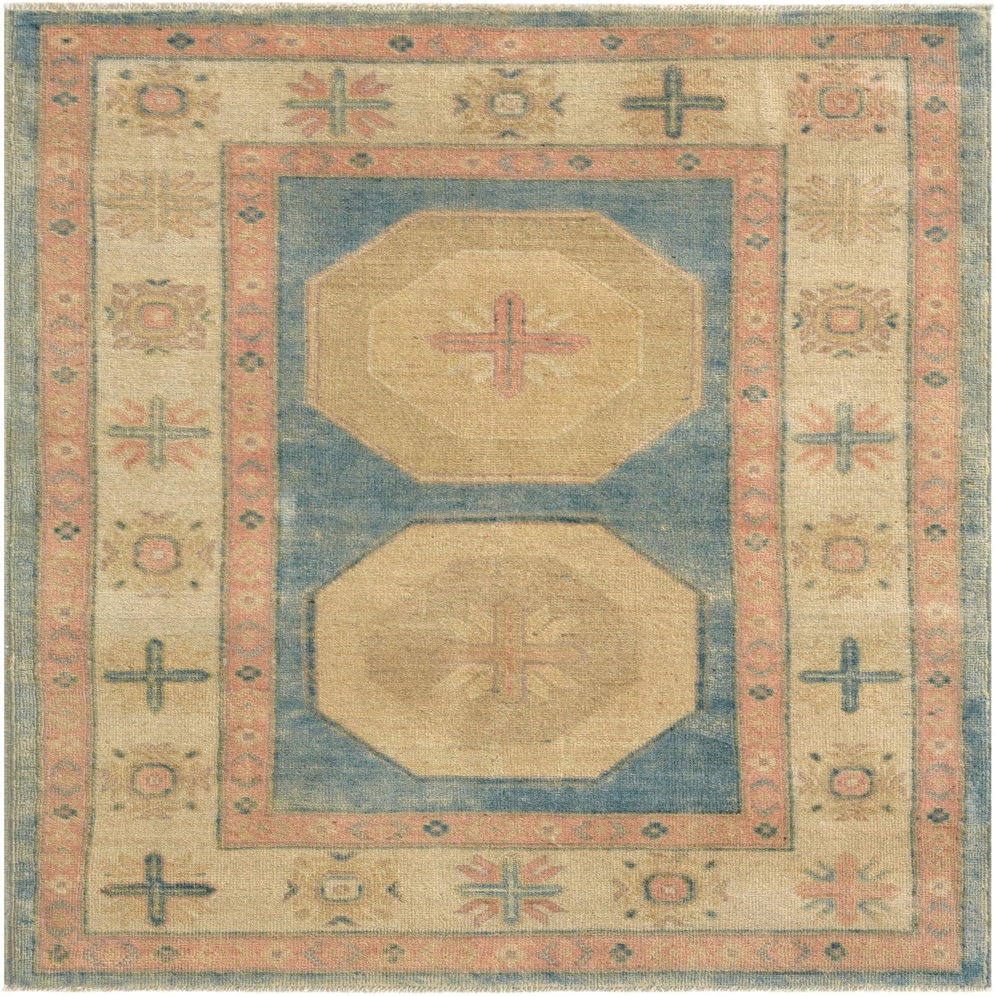 Primary color is Blue. Colors in this rug include: Blue, Beige, Brown, Ivory, Pink.