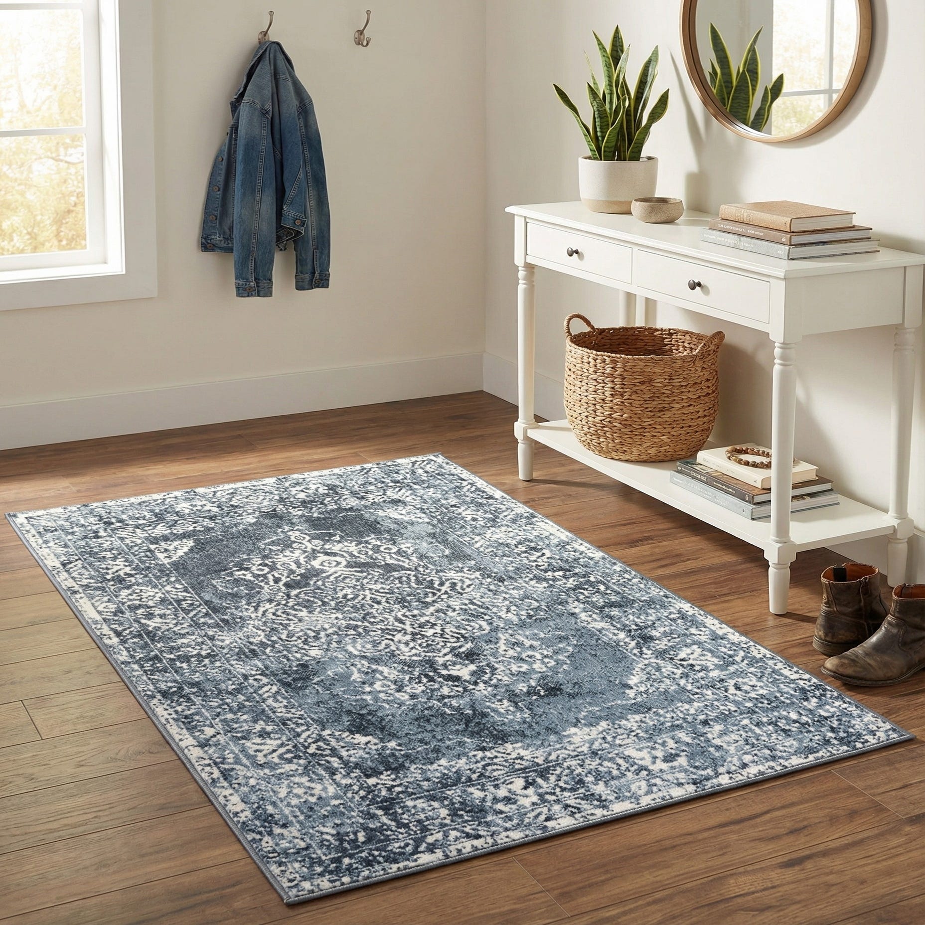 Primary color is Blue. Colors in this rug include: Blue, Ivory.