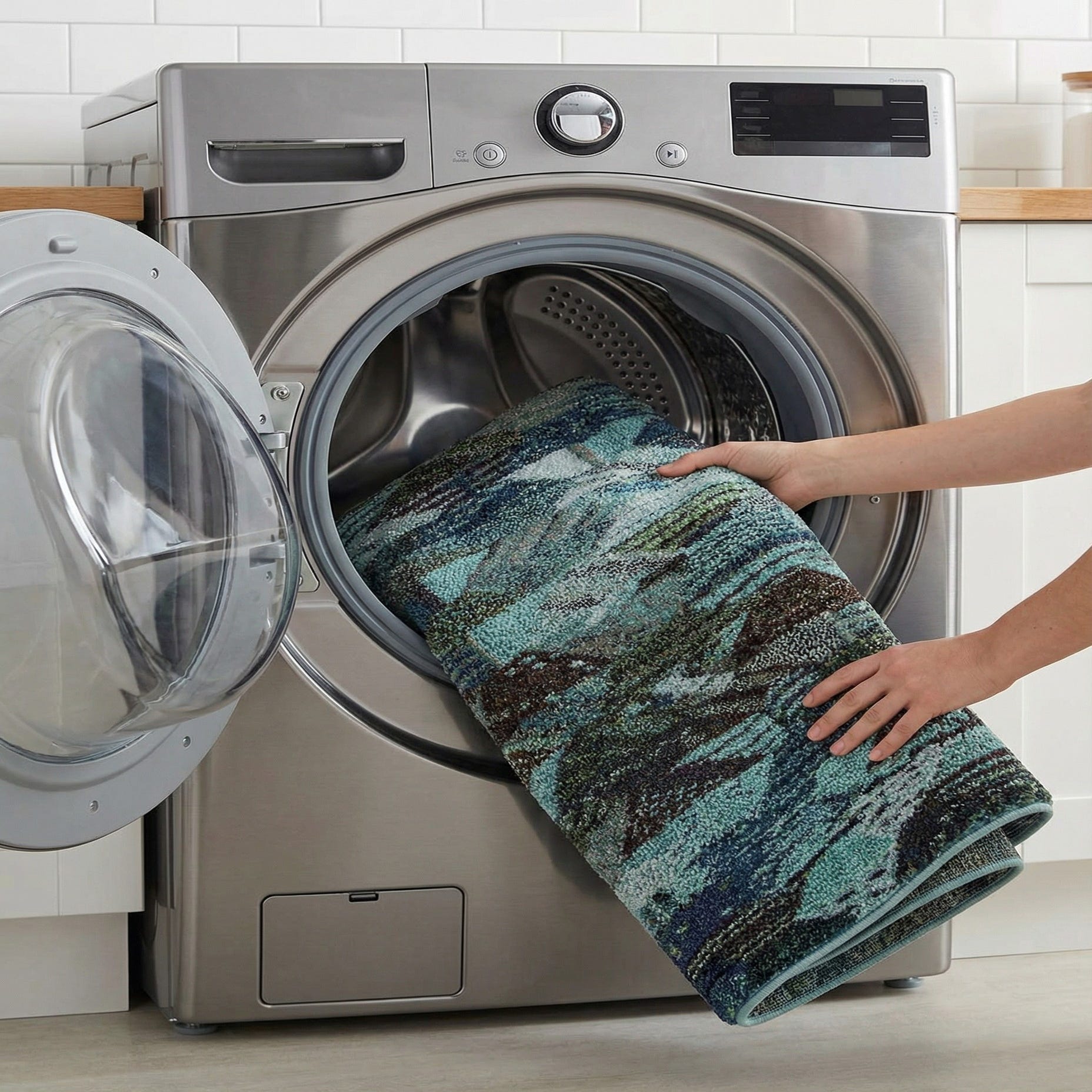 Primary color is Blue. Colors in this rug include: Blue, Gray, Green, Light Blue, Navy Blue.